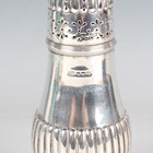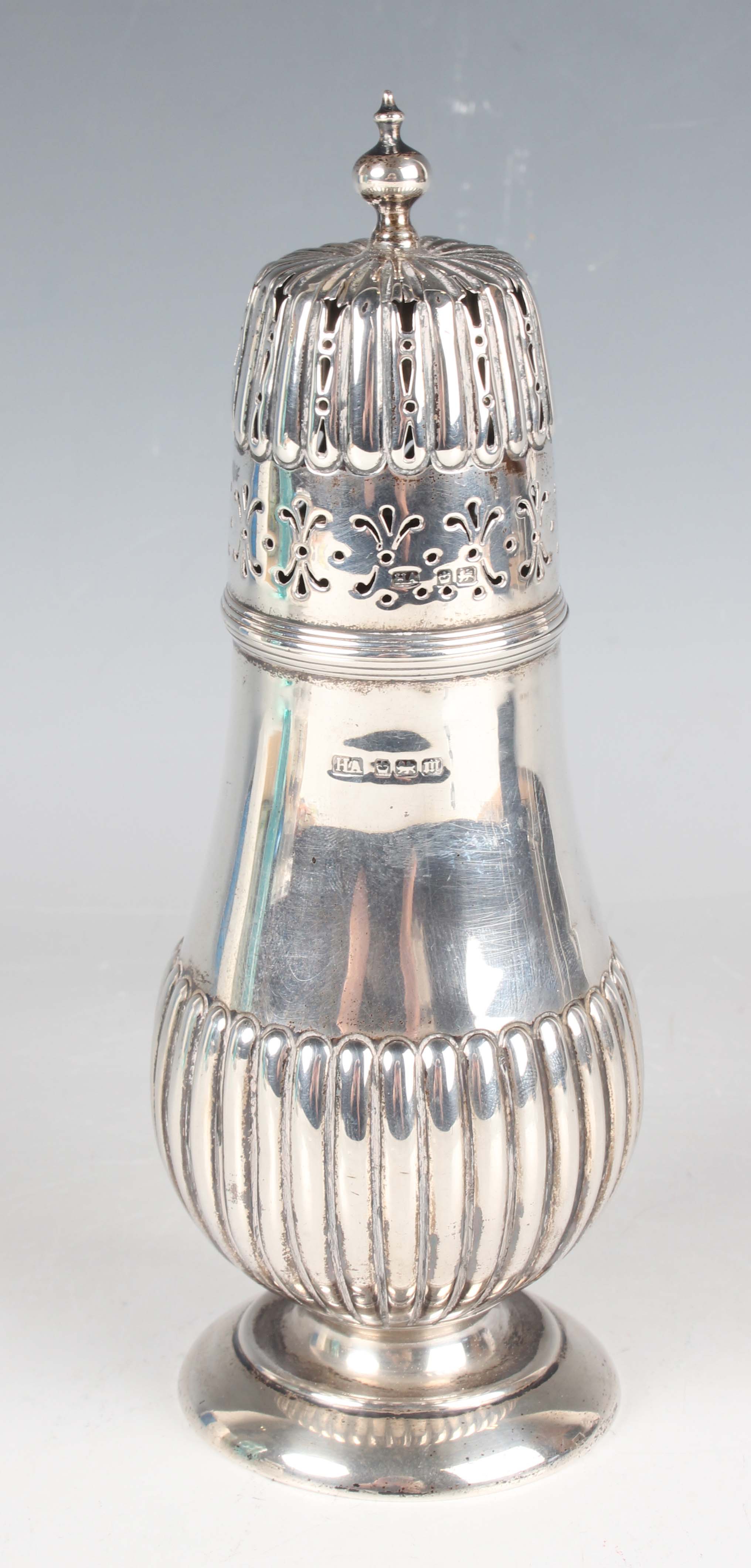 An Edwardian silver half-reeded baluster sugar caster with pierced domed cover and knop finial, on a circular foot, Sheffield 1904 by Atkin Brothers, weight 214.6g, height 20cm.