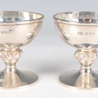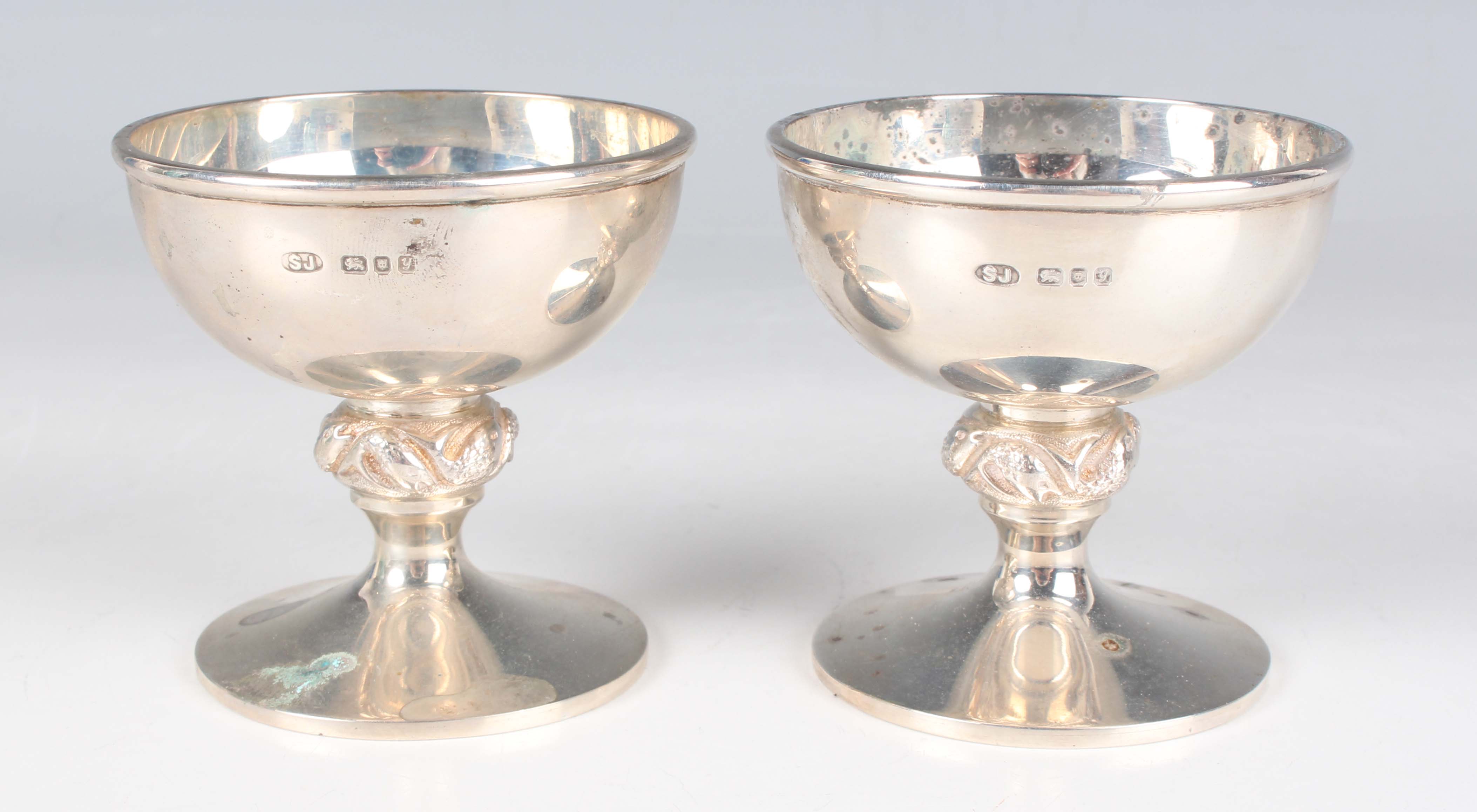 A pair of Elizabeth II silver small cups, each circular bowl above a knop stem cast with fishes, on a circular foot, London 1998 by Sarah Jones, total weight 241.5g, height 6.5cm.