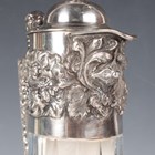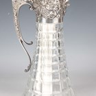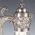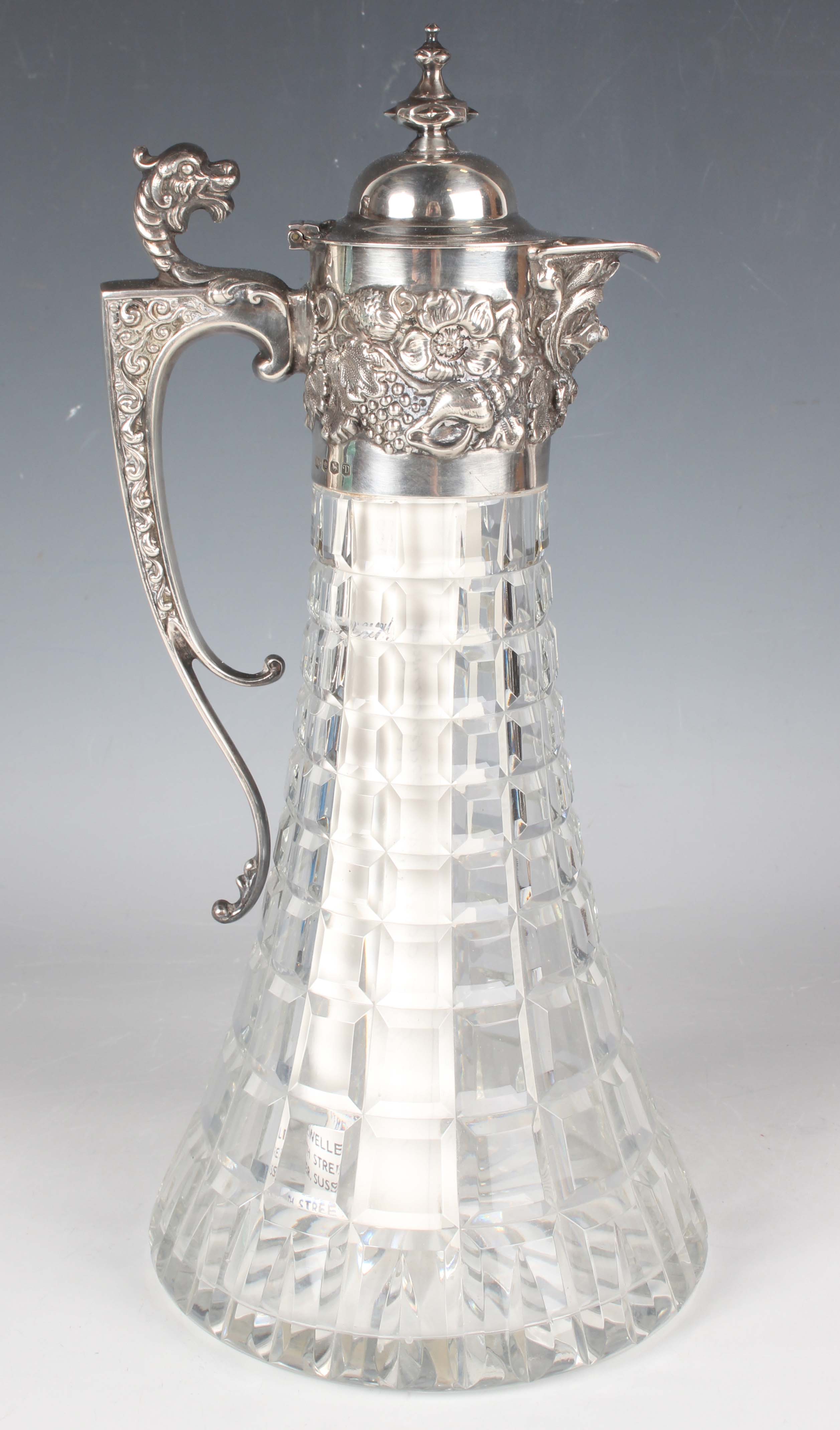 An Elizabeth II silver mounted cut glass claret jug, the domed hinged lid with knop finial above a relief decorated collar of fruit, flowers and shells, flanked by a griffon mask capped scroll handle, Sheffield 1971 by Roberts & Belk, height 30.5cm.