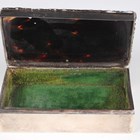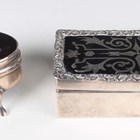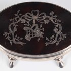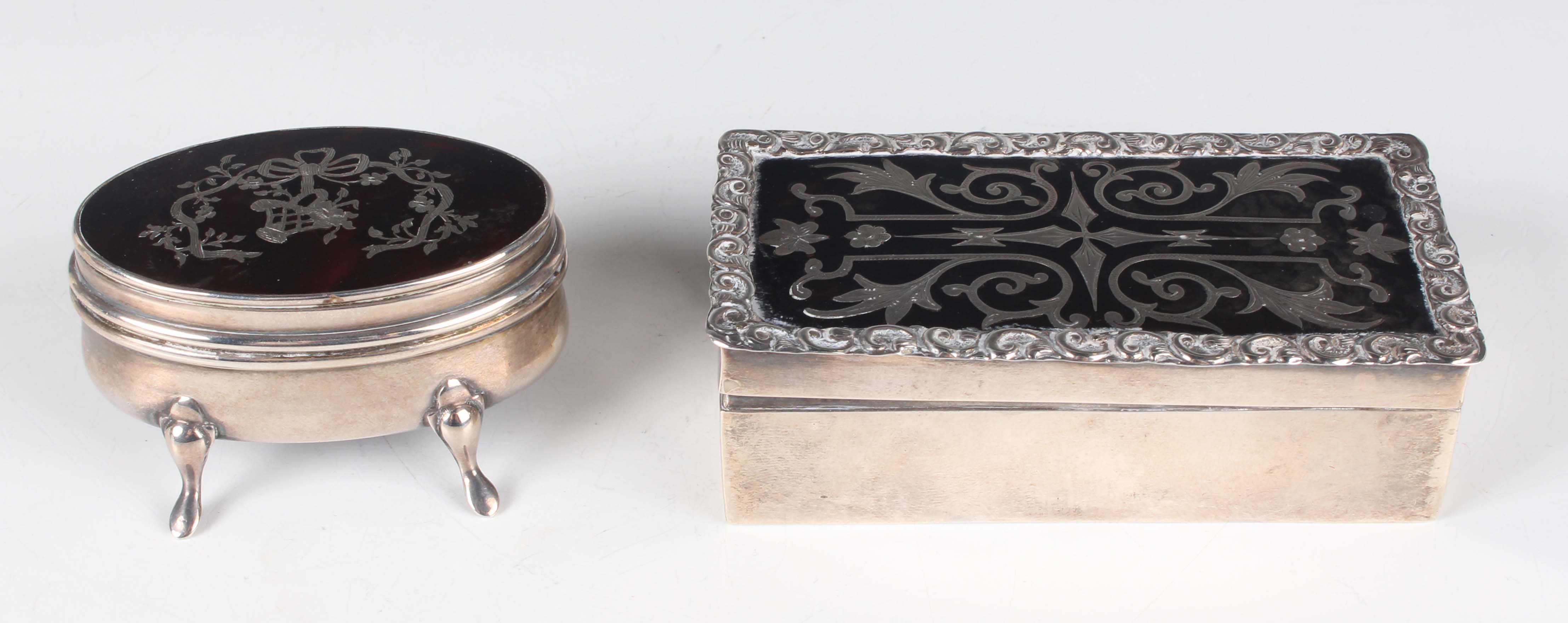 An Edwardian silver and tortoiseshell rectangular trinket box, the hinged lid piqué inlaid with flowers and foliate scrolls within a scroll decorated rim, revealing a fitted interior, London 1909 by Walker & Hall, length 9.7cm, and another silver and tortoiseshell oval trinket box and cover, piqué inlaid with a flower basket, ribbons and flowers, revealing a fitted interior, raised on scroll legs, Birmingham 1908 by Levi & Salaman, length 6.3cm.