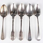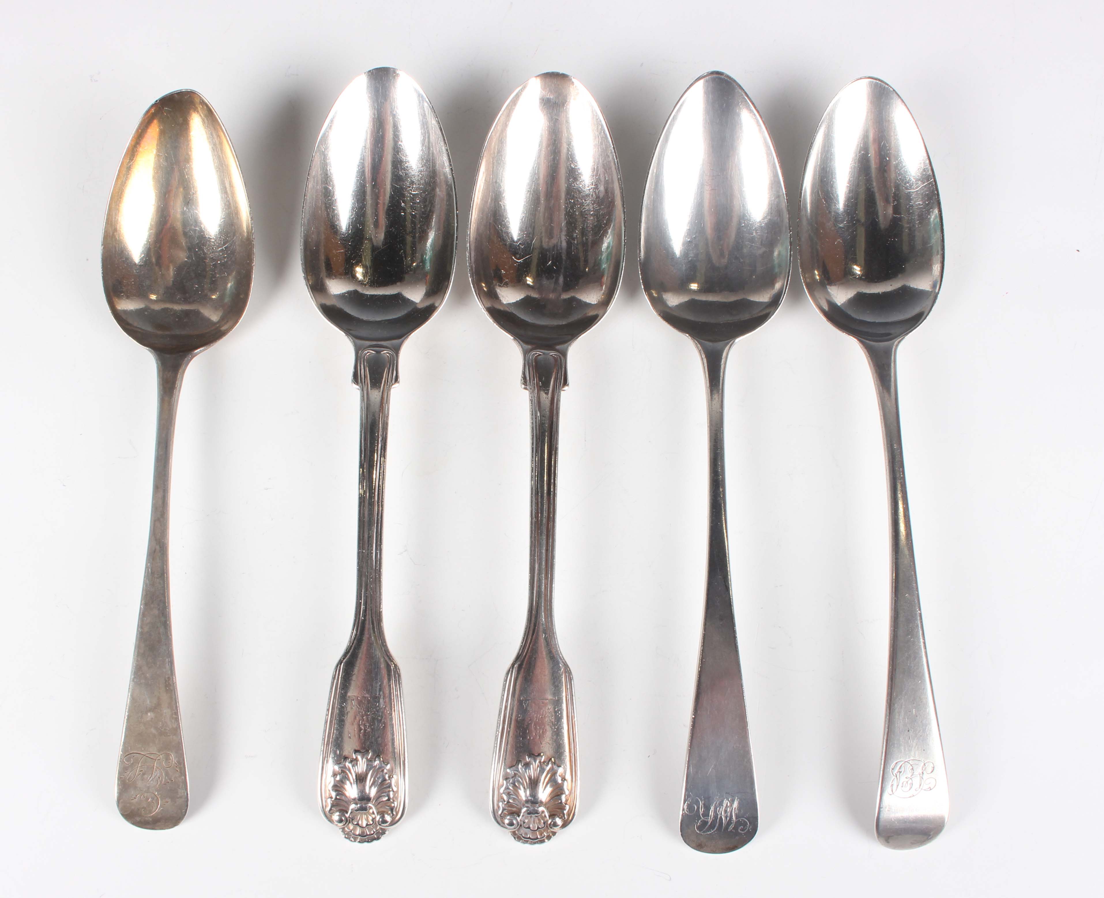 A pair of early Victorian silver Fiddle Husk with Thread Heel pattern tablespoons, London 1842 by William Theobalds, length 21.5cm, together with three other silver Old English pattern tablespoons, various dates and makers, total weight 368.7g.