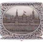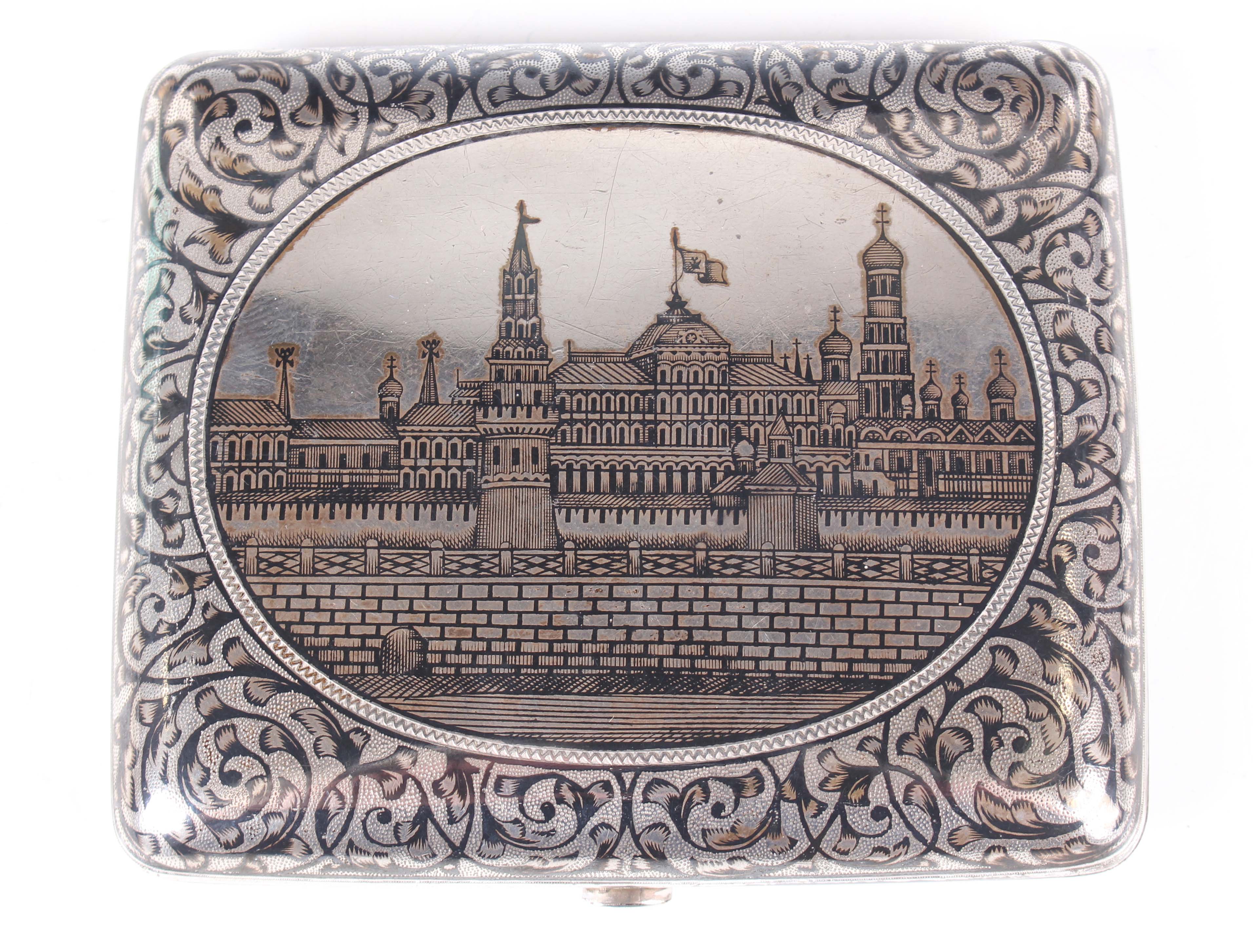 A late 19th century Russian silver and niello curved rectangular cigarette case, 84 zolotnik, the front decorated with a view of the Kremlin within an oval surround framed by foliate scrolls, the underside similarly decorated, Moscow by Gustav Klingert, weight 139.7g, length 9.3cm.