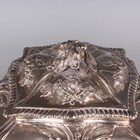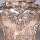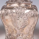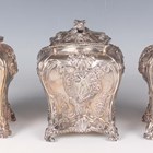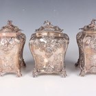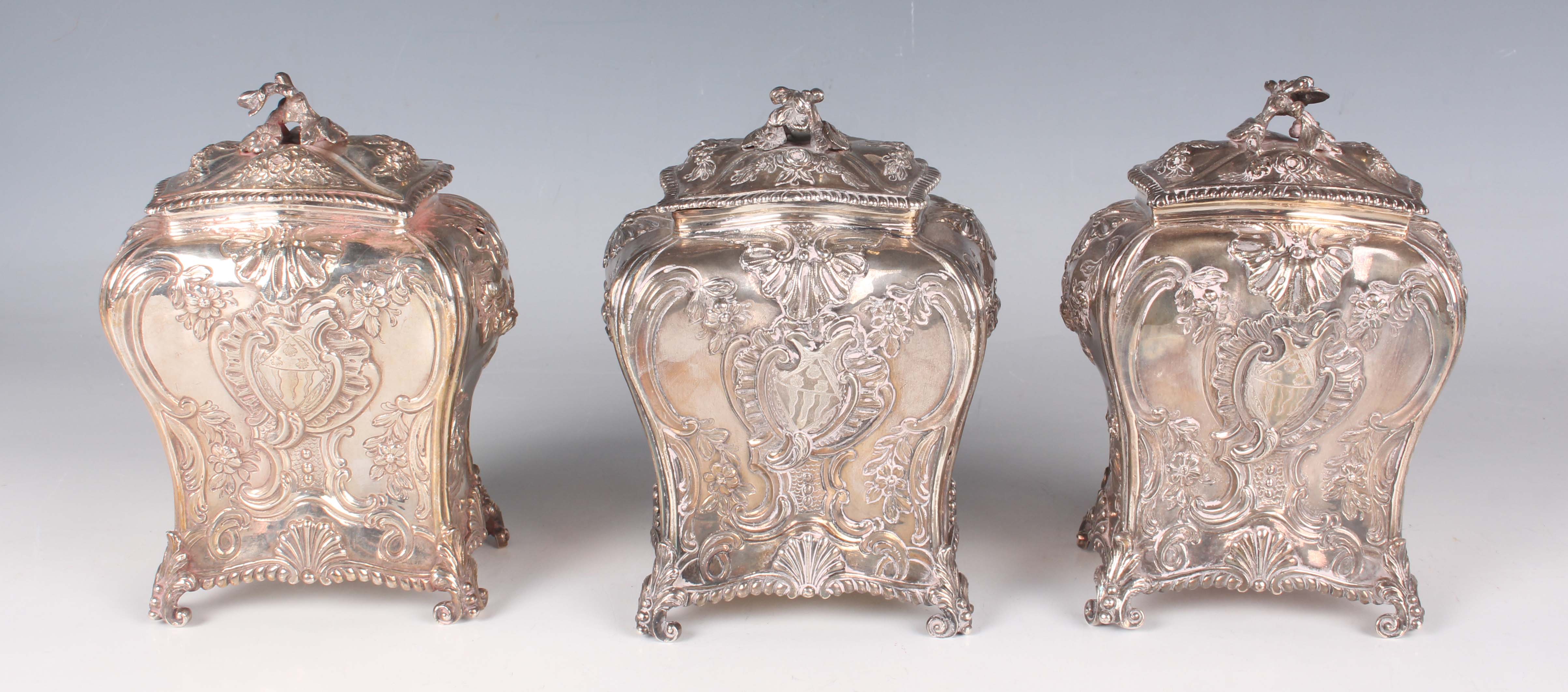 A set of three George III silver graduated tea caddies and covers with foliate finials, each of rectangular bombé form, chased with flowers and rococo scrolls, on foliate and scroll feet, London 1762 by Emick Romer, total weight 878.7g, heights 13.5cm and 14cm.