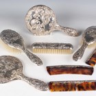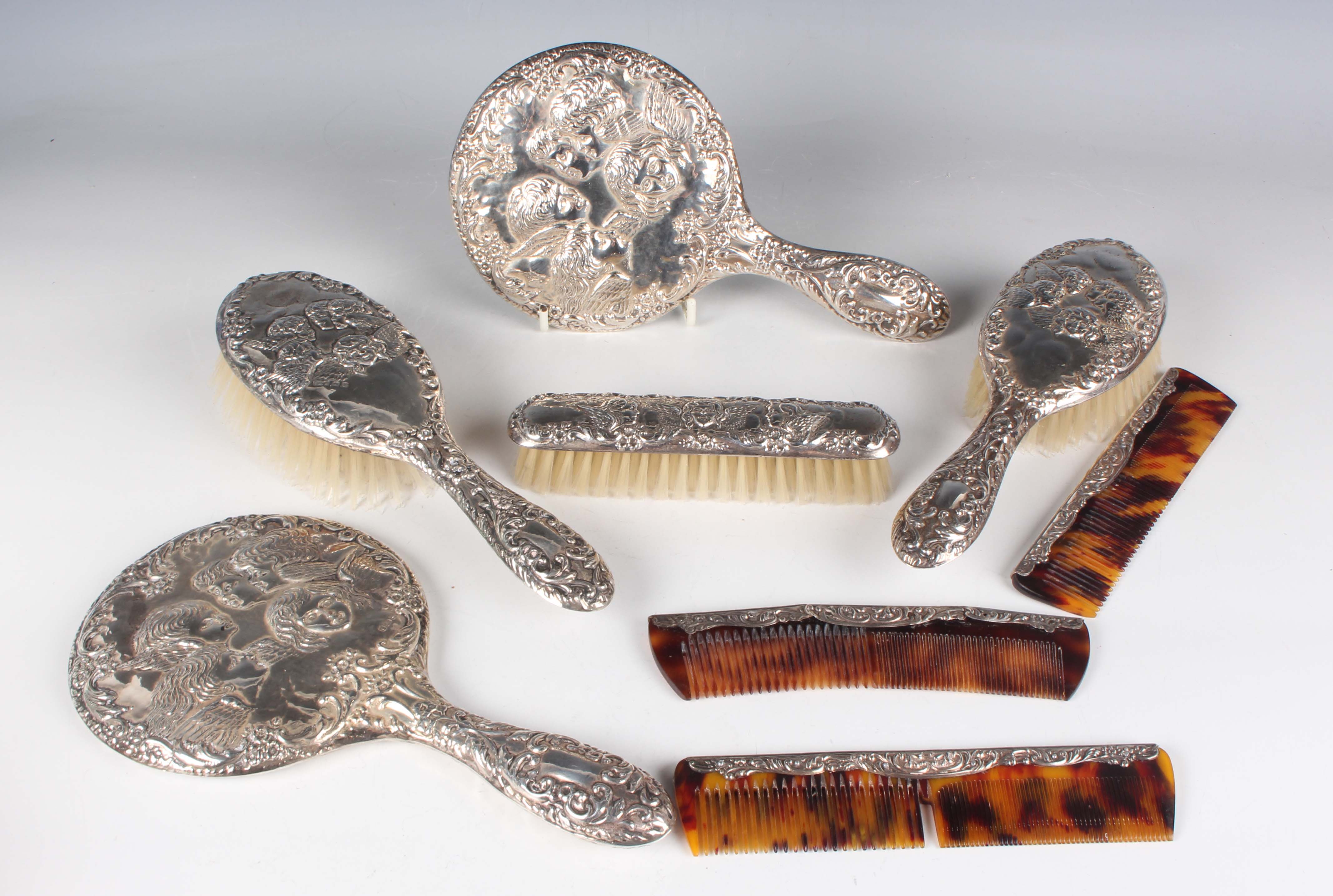 An Elizabeth II silver mounted four-piece dressing table set, decorated with amorini, comprising hand mirror, hairbrush, clothes brush and comb, Birmingham 1987, another similar silver three-piece dressing table set, comprising hand mirror, hairbrush and comb, Birmingham 1957, and a silver mounted comb, Birmingham 1961, all by W.I. Broadway & Co.