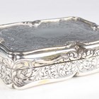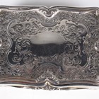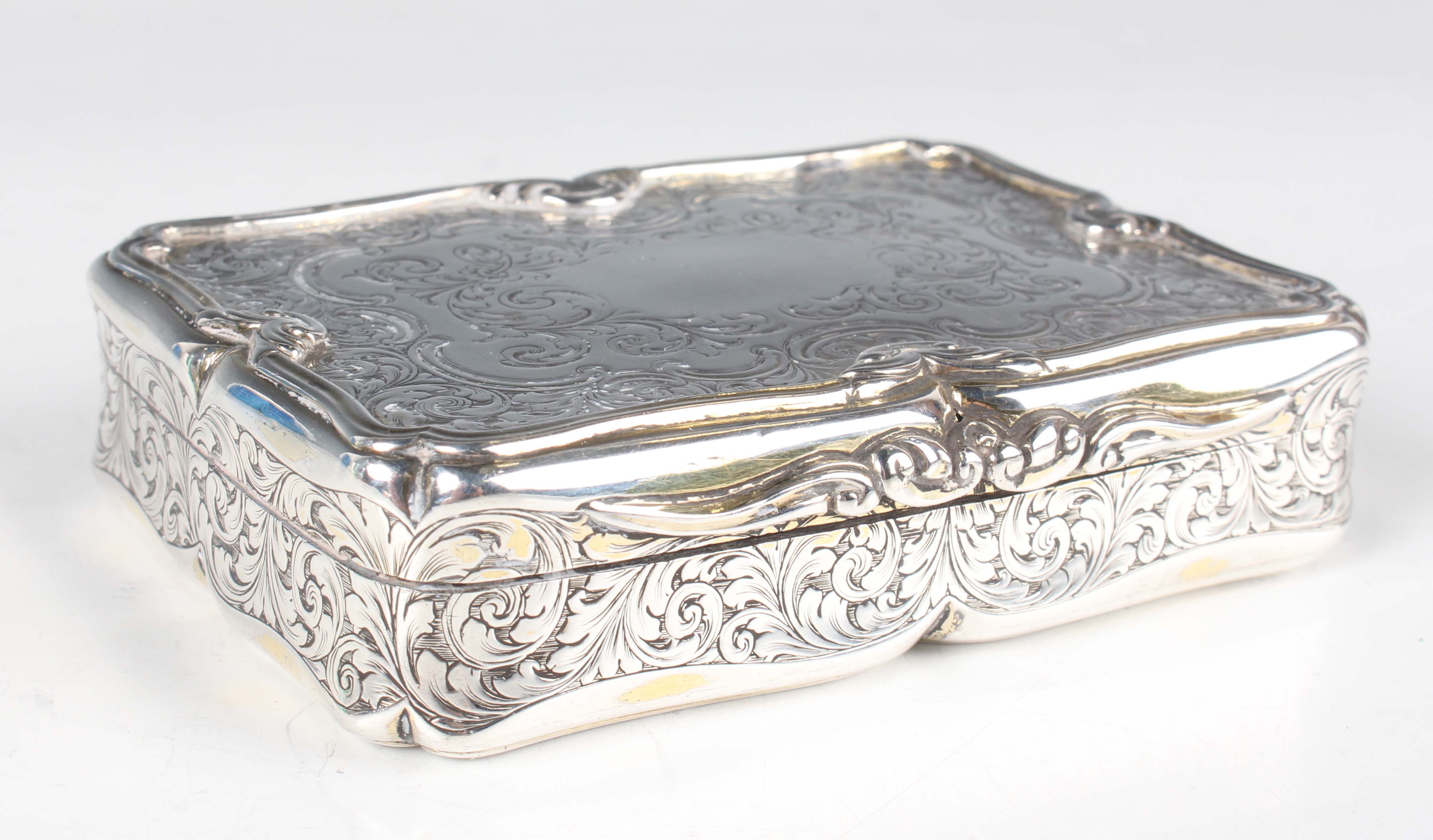 An early Victorian silver rectangular snuff box, the hinged lid, sides and base engraved with foliate scrolls within raised scroll rims, Birmingham 1848 by Nathaniel Mills, weight 172.2g, length 9.5cm.
