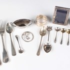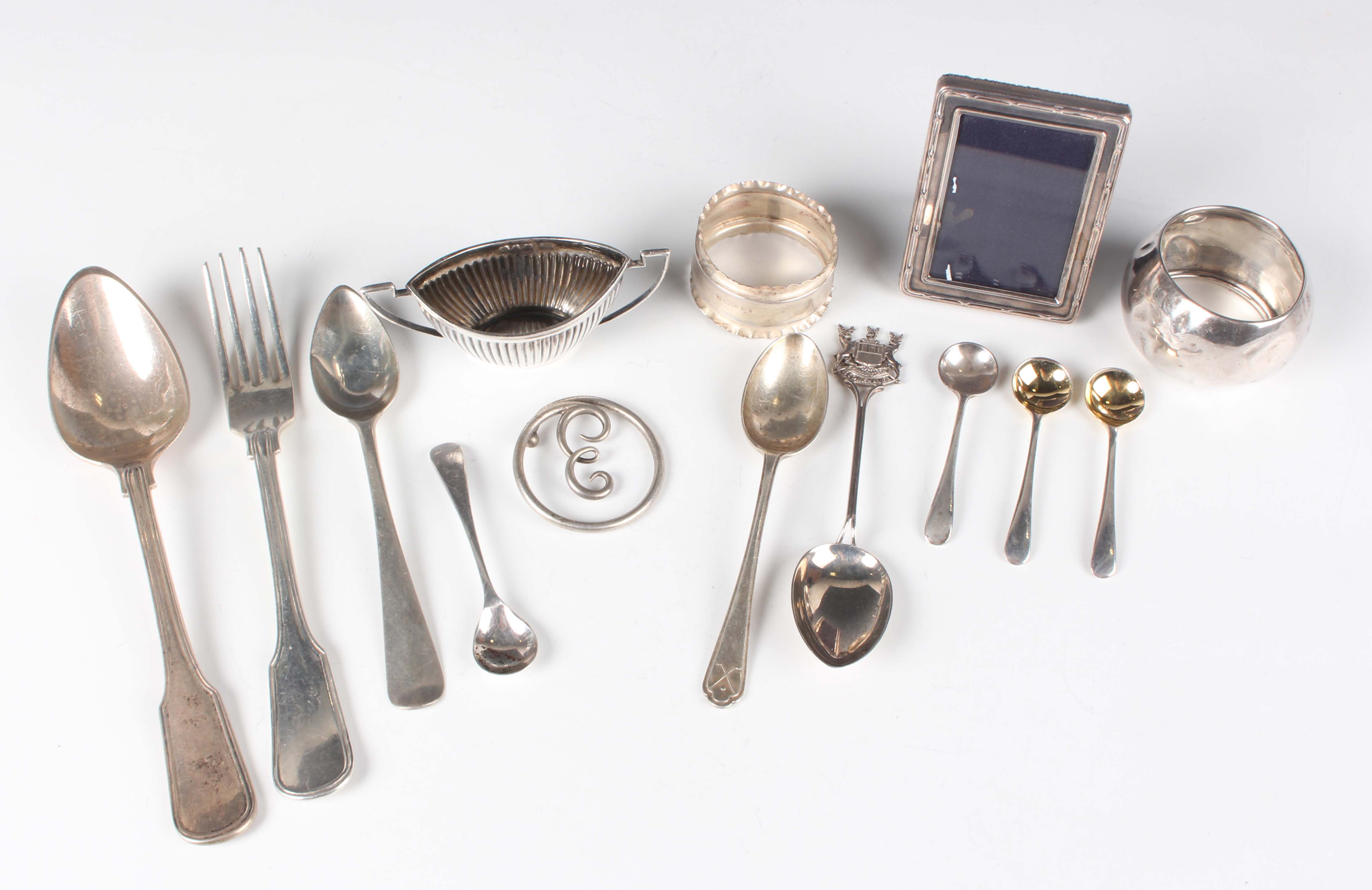 A Dutch silver Fiddle and Thread pattern christening spoon and fork, date letter for 1884, and a Dutch silver teaspoon, total weight 124.1g, a French silver clip of circular form with the initial 'E' to the centre, weight 12.7g, diameter 4cm, and a small group of other silver, including a salt, two napkin rings, a small photograph frame and various spoons, weighable items 78.9g, together with a plated mustard spoon.