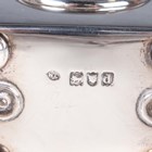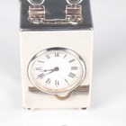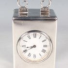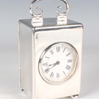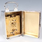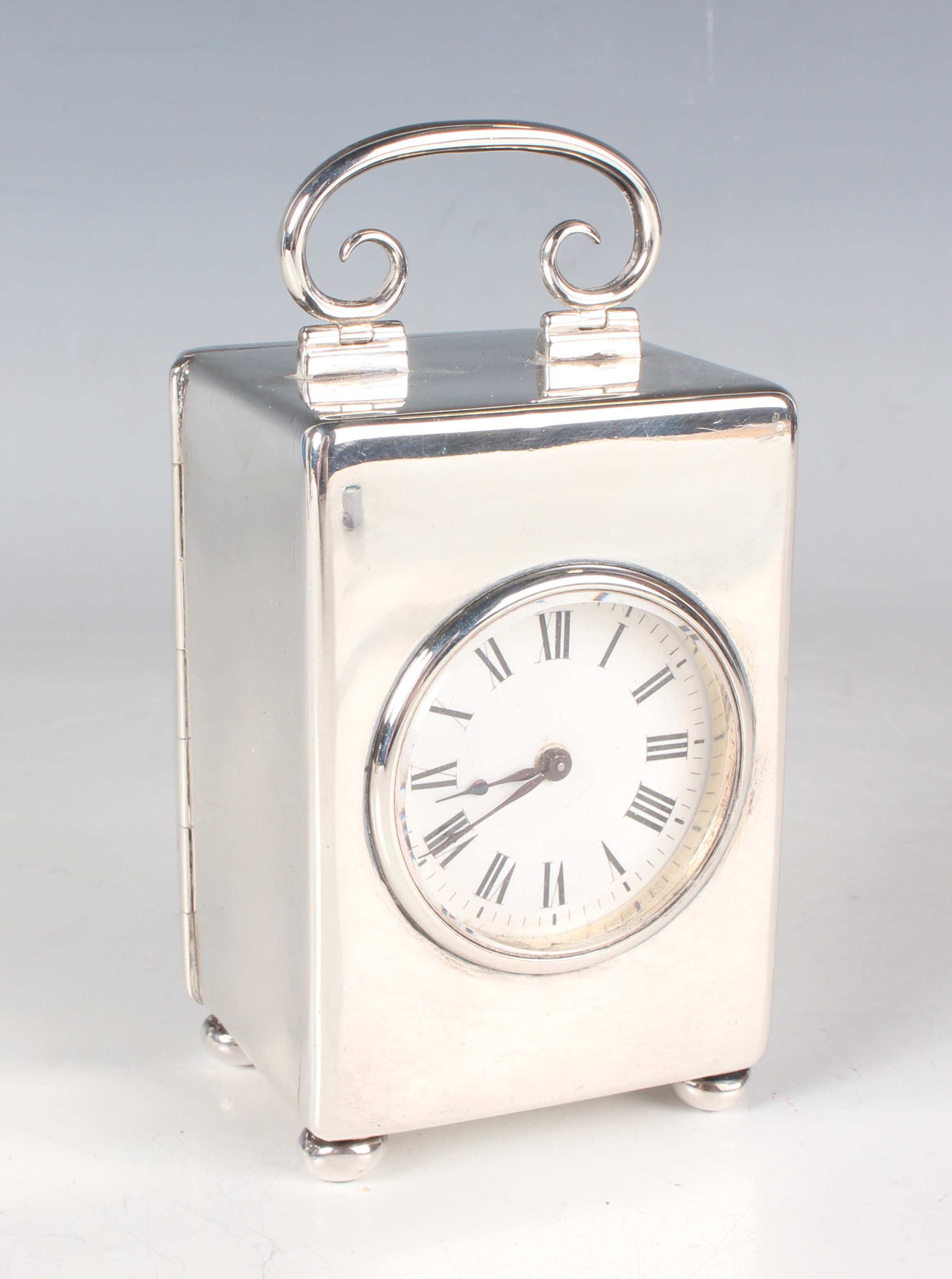 A late Victorian silver cased carriage timepiece, the eight day movement with platform escapement, the circular white enamelled dial with black Roman numerals, the rectangular case with scroll carrying handle, on bun feet, London 1899 by William Comyns & Sons, total height 11.8cm, with a key.
