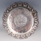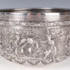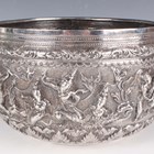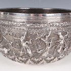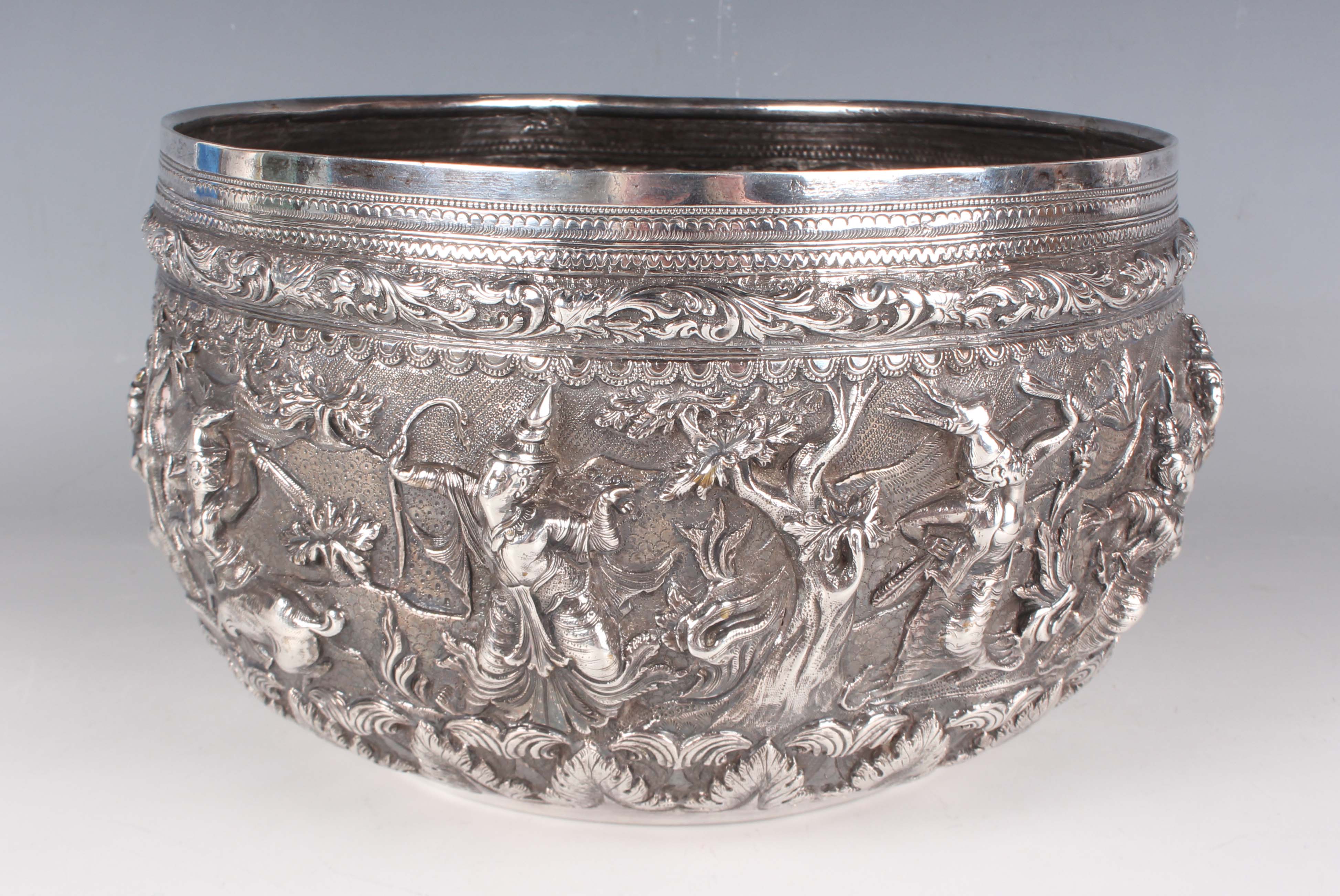 A 19th century Burmese silver thabeik bowl, repoussé decorated with a continuous scene of Buddhistic figures within foliate scrolls, engraved foliate mark to base, weight 1127.5g, height 13.7cm, diameter 23.5cm.
