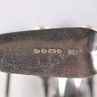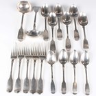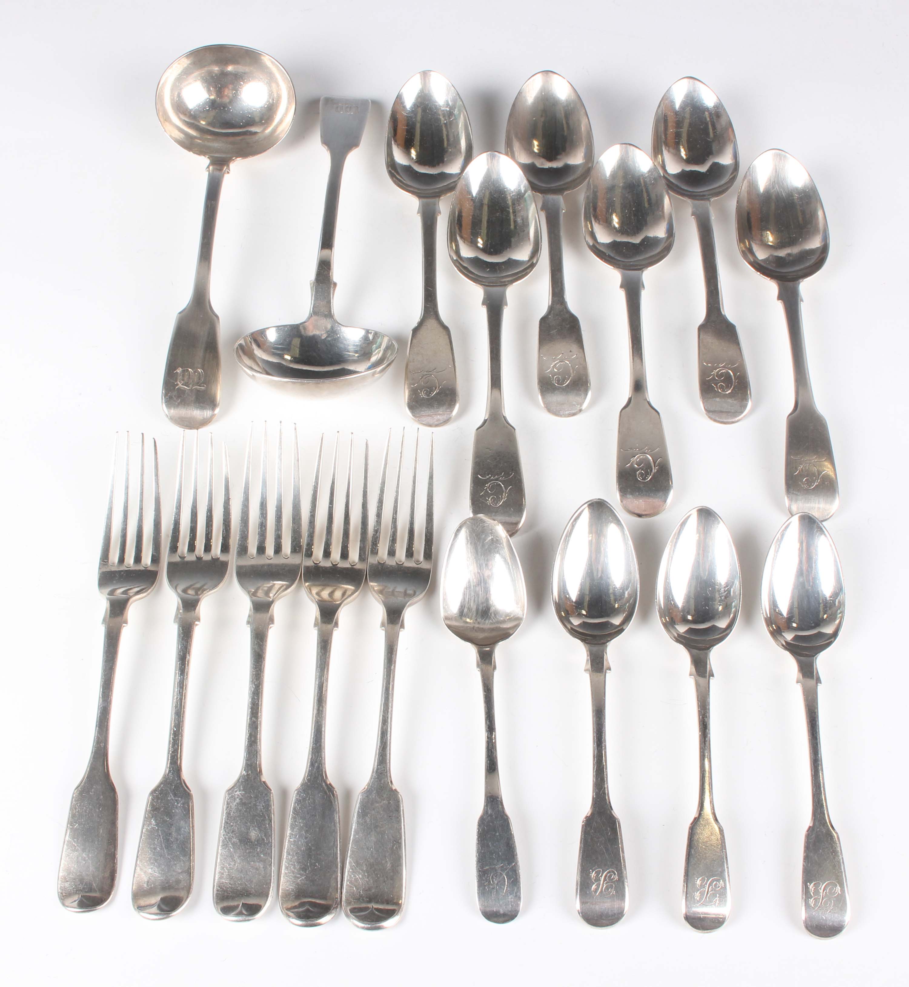 A set of six William IV silver Fiddle pattern dessert spoons, London 1835, and a pair of silver Fiddle pattern sauce ladles, London 1843, all by Charles Boyton I, and a small group of other silver Fiddle pattern cutlery, comprising five dessert forks and four teaspoons, various dates and makers, total weight 713.6g.