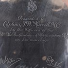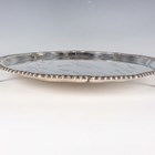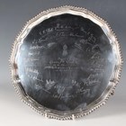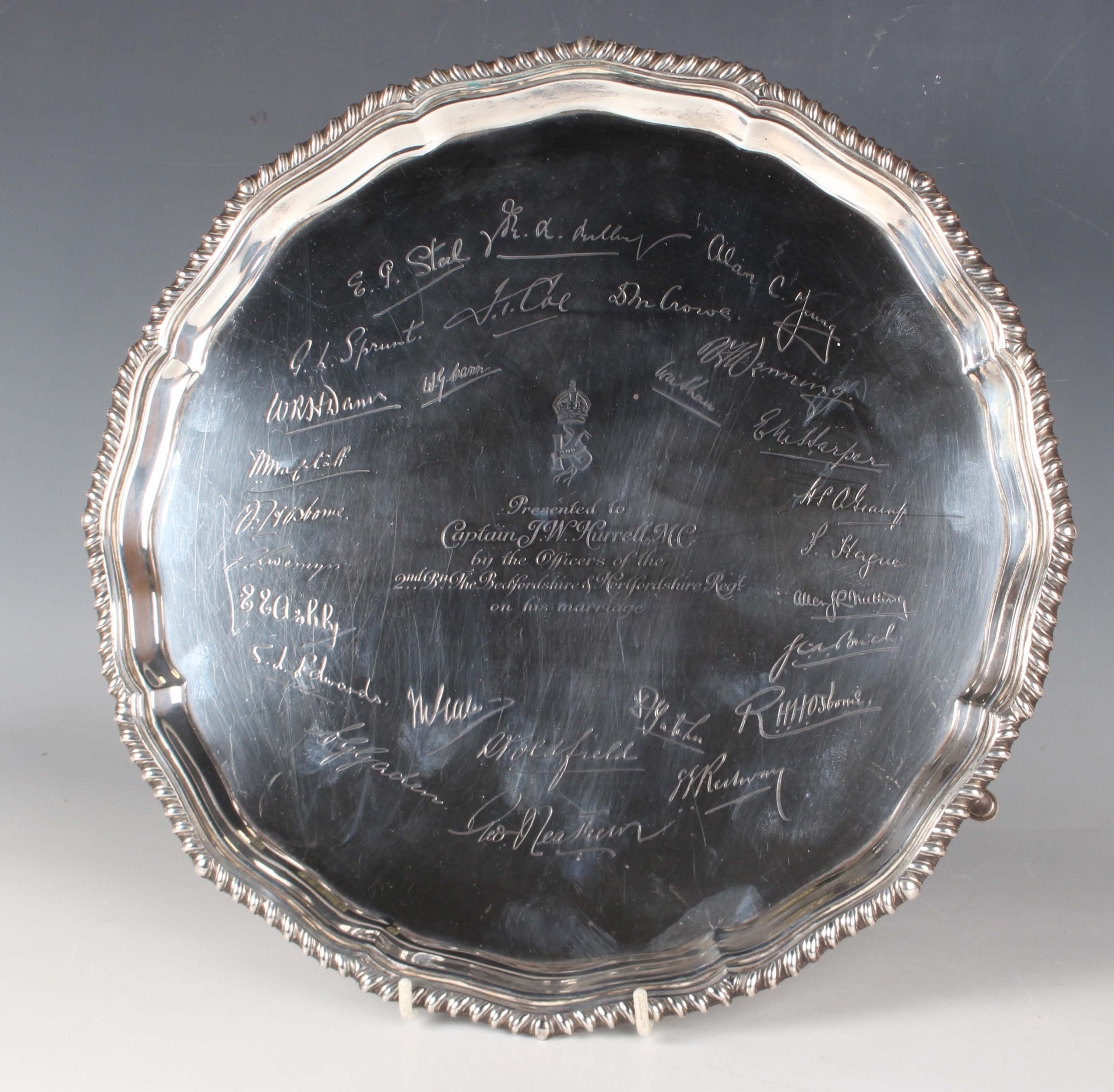 A George V silver circular salver, the centre crest engraved above a presentation inscription 'Presented to Captain J.W. Hurrell MC by the Officers of the 2nd Bn The Bedfordshire & Hertfordshire Regt on his marriage', framed by facsimile signatures within a gadrooned rim, on scroll feet, London 1925 by Carrington & Co, weight 891g, diameter 32cm.