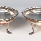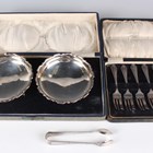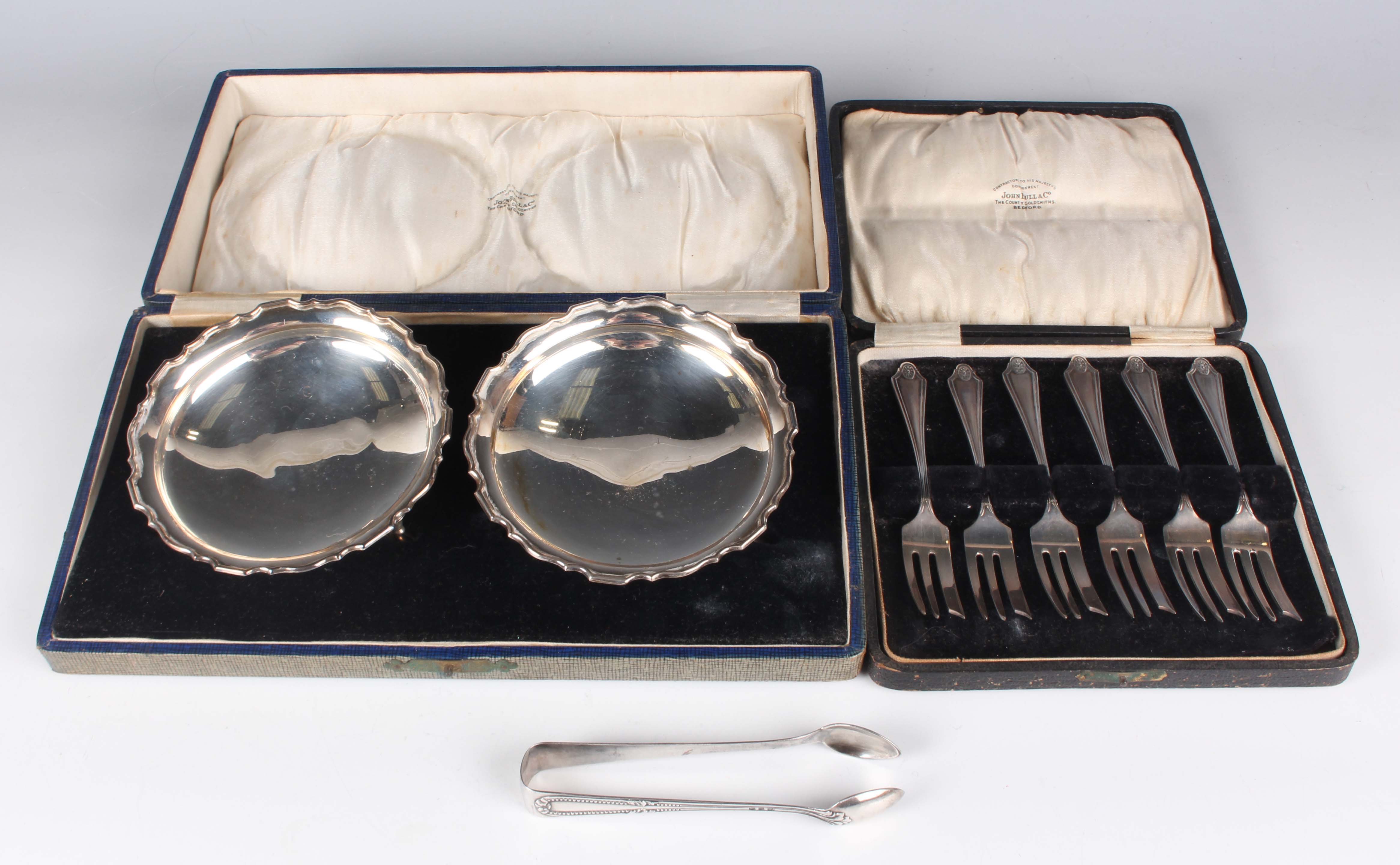 A pair of George V silver circular bonbon dishes, each with a shaped rim, on scroll legs, Birmingham 1925 by William Devenport, diameter 10.5cm, and a set of six silver cake forks, Birmingham 1925, total weight 195.9g, both cased, together with a pair of .800 silver sugar tongs, weight 16.8g.