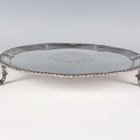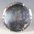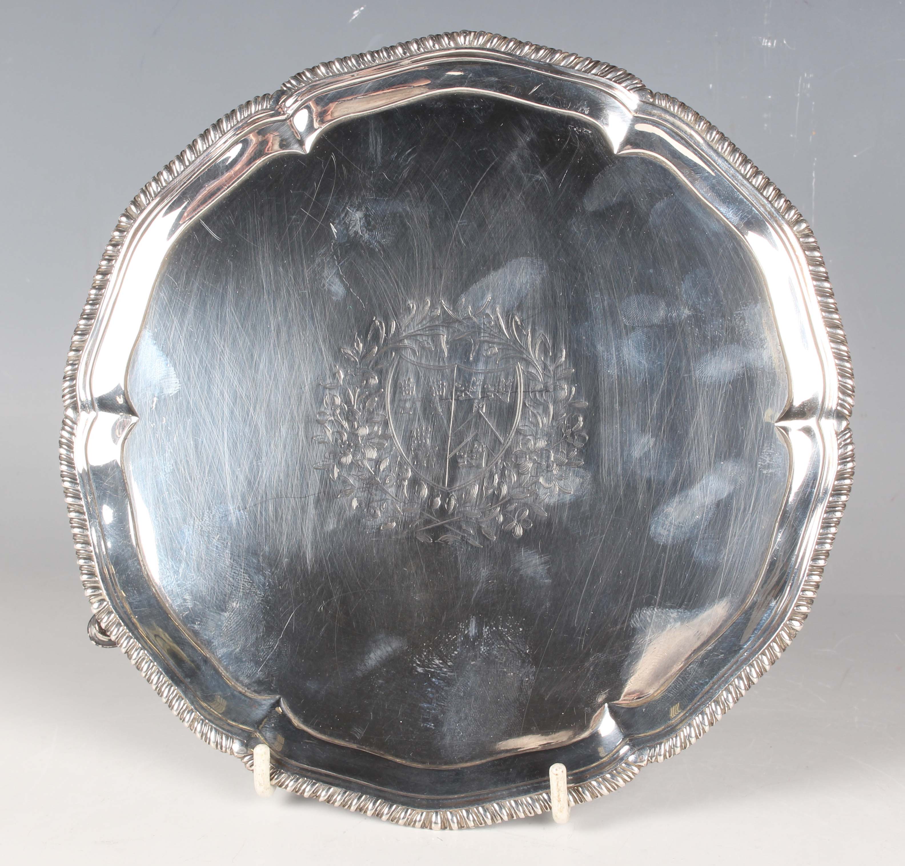 A George III silver circular card salver, shield and crest engraved within a foliate border and gadrooned rim, on scroll legs terminating in hoof feet, London 1771 by IC, weight 361.4g, diameter 20cm.
