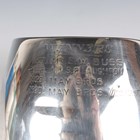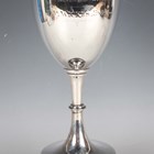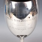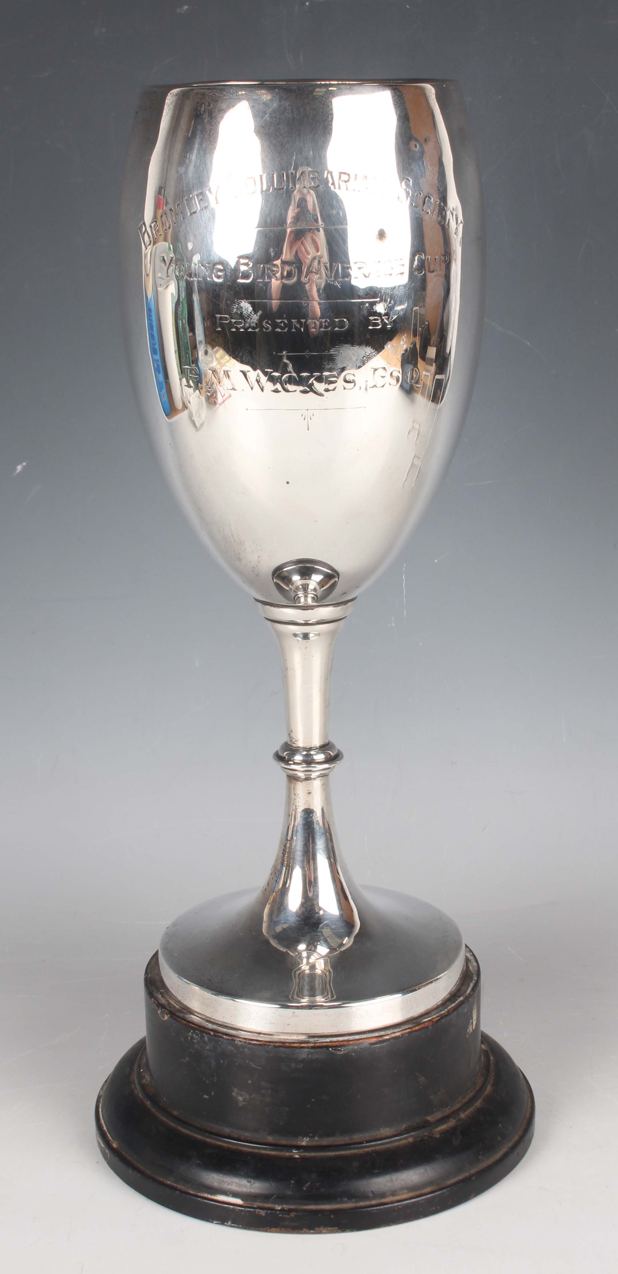 A George V silver trophy cup, the ovoid body engraved with inscription 'Bromley Columbarian Society Young Bird Average Cup, Presented by F.M. Wicks Esq' opposing four winners, on a tapering knop stem and circular foot, Birmingham 1925 by Henry Wilkinson Ltd, weight 346.5g, height 27cm, with an ebonized plinth.