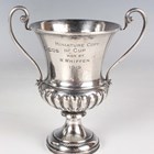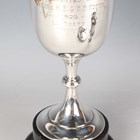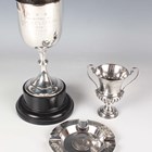 A George V silver trophy cup, the 'U' shaped body with engraved inscription 'B.C.S... 1929 La Teste' opposing three winners, on a tapering knop stem and circular foot, Birmingham 1929 by William Hutton & Sons Ltd, height 16.8cm, with an ebonized plinth, together with a small silver urn shaped two-handled trophy cup, inscription engraved 'Miniature Copy of Cup Won by... 1919' opposing 'Chislehurst Conservative and Unionist Club, The Arthur Marshall Challenge Cup for Bowls... 1914', London 1919 by Goldsmiths & Silversmiths Co Ltd, height 10cm, and a silver ashtray, the rim detailed 'North British & Mercantile Insurance Company' framing the crest, London 1903, diameter 10.8cm, excluding plinth, total weight 282.3g.
