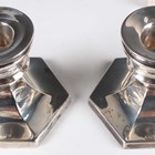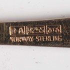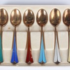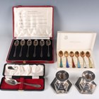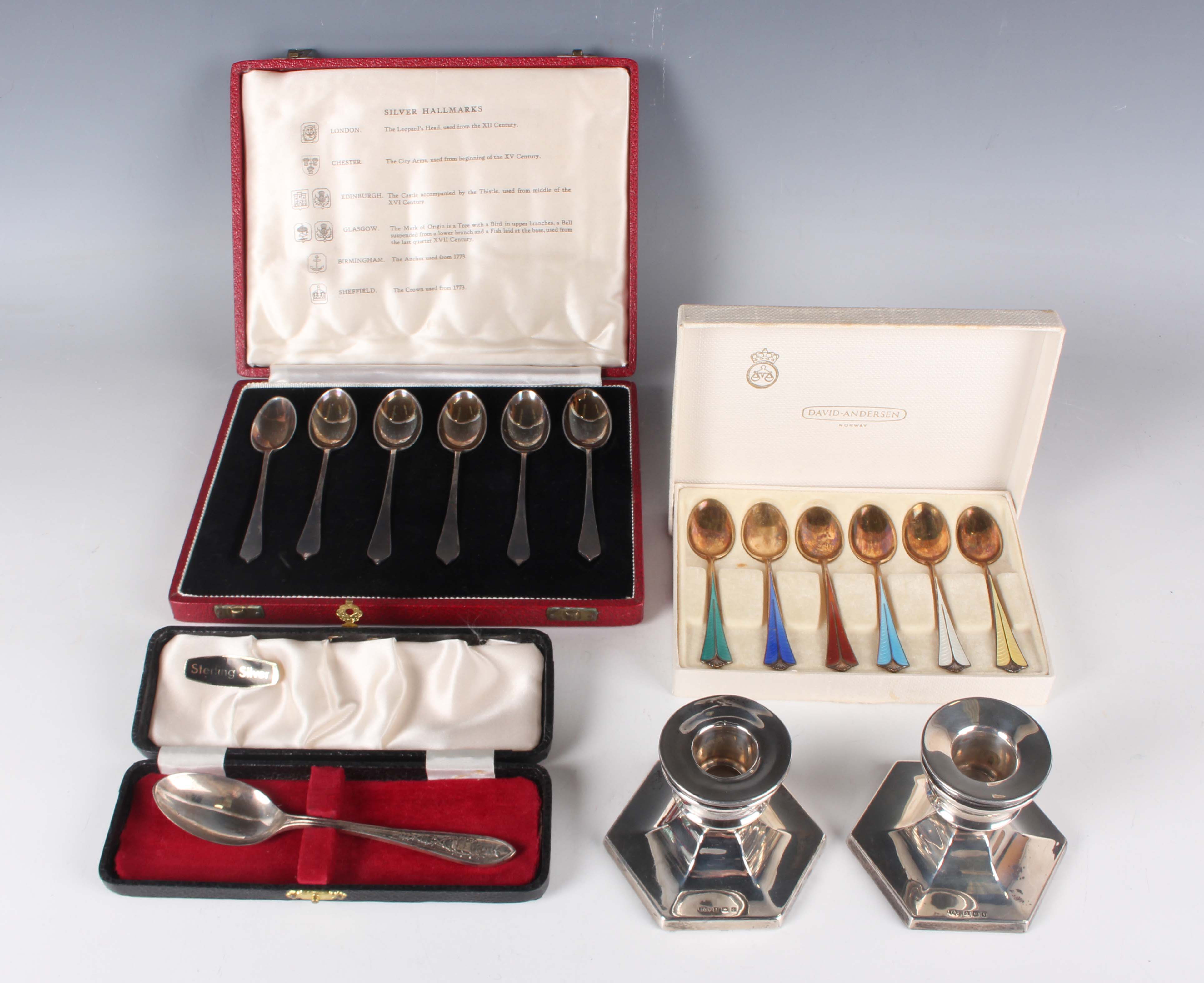 A set of six Elizabeth II silver 'Silver Hallmarks' teaspoons, each with a different assay mark, 1955 and 1957, cased, a set of six Norwegian David Andersen sterling and enamelled coffee spoons, each handle enamelled in a different colour, boxed, and a silver christening spoon, Sheffield 1965, cased, total weight 150.3g, together with a pair of silver stub candlesticks, each with detachable nozzle above a hexagonal weighted base, Birmingham 1963, height 6cm.