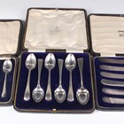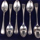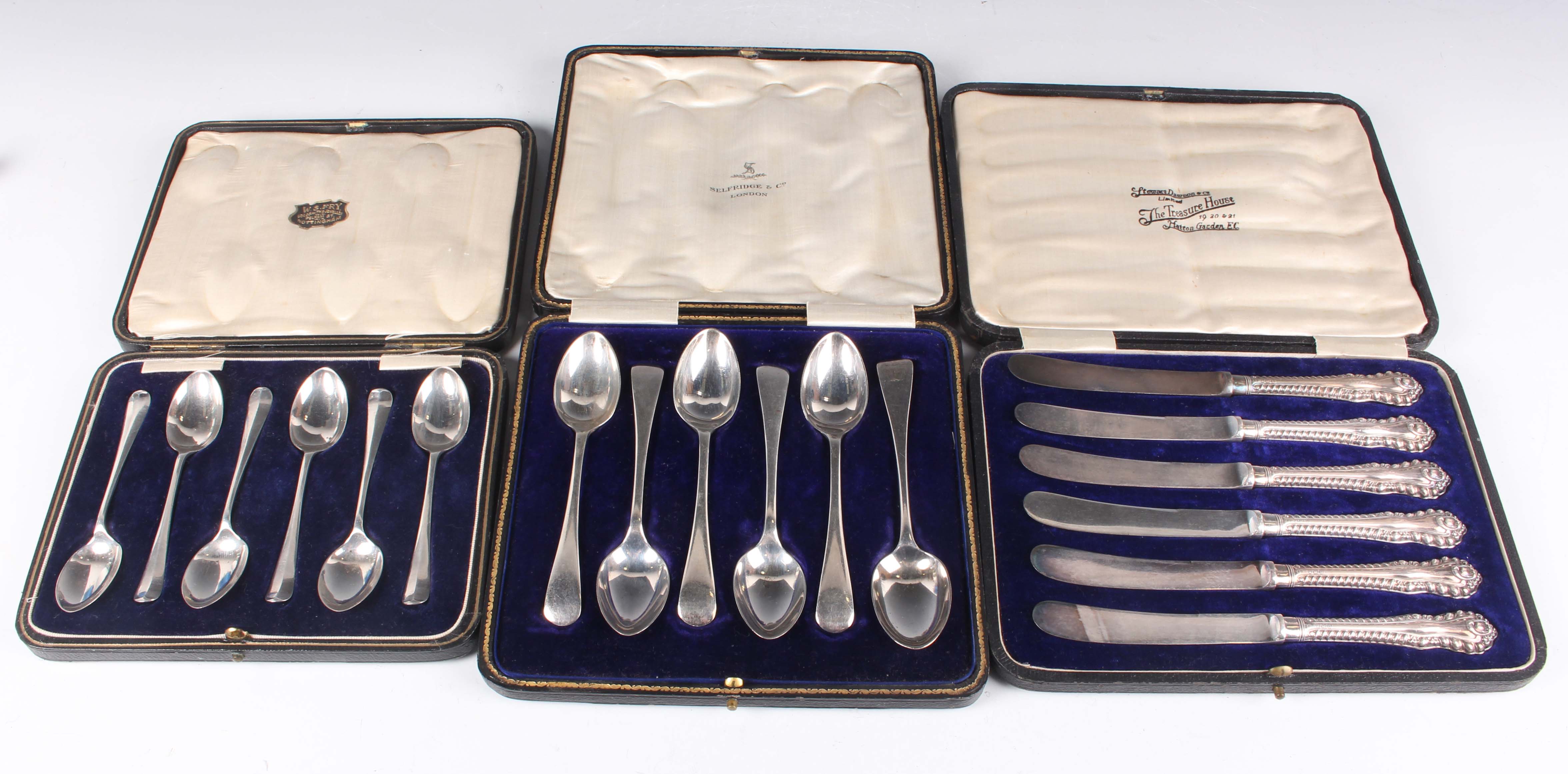 A set of six George V silver Hanoverian Rat Tail pattern coffee spoons, Sheffield 1922 by Cooper Brothers & Sons Ltd, a set of five silver Old English pattern teaspoons, Sheffield 1911 by Joseph Rodgers & Sons, and another silver teaspoon, total weight 190.6g, together with a set of six silver handled butter knives, Sheffield 1909, all cased.