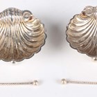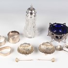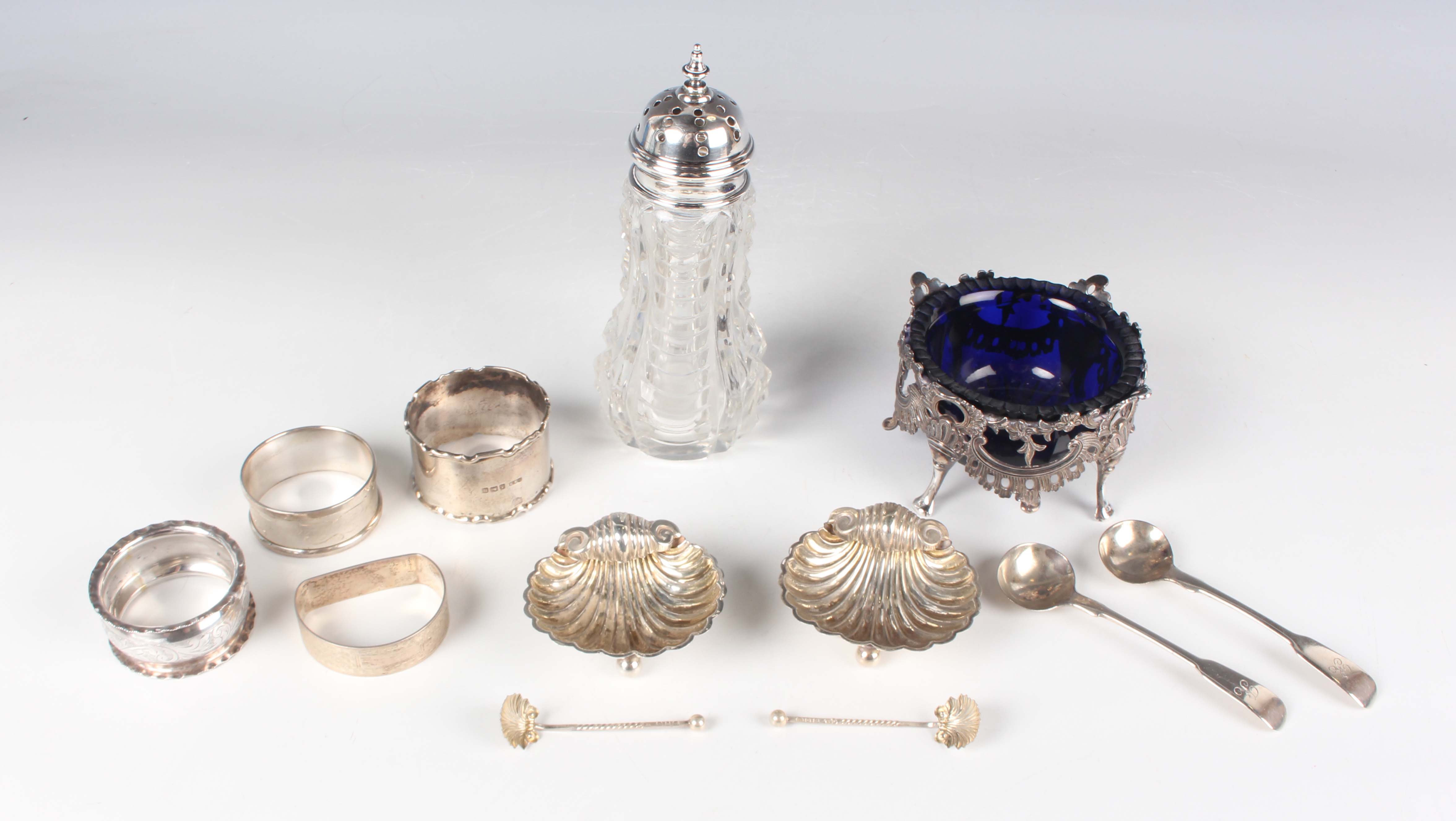 An early Victorian silver circular salt, cast and pierced with flowers and foliate scrolls above 'C' scroll swags, on scroll legs, Birmingham 1845 by Yapp & Woodward, diameter 9.2cm, height 5.3cm, and a small group of other silver, including a pair of scallop shell salts and matching salt spoons, Birmingham 1896, and four napkin rings, various dates and makers, total weight excluding glass 209g.