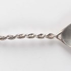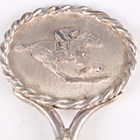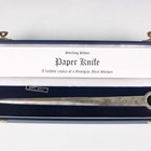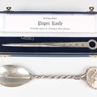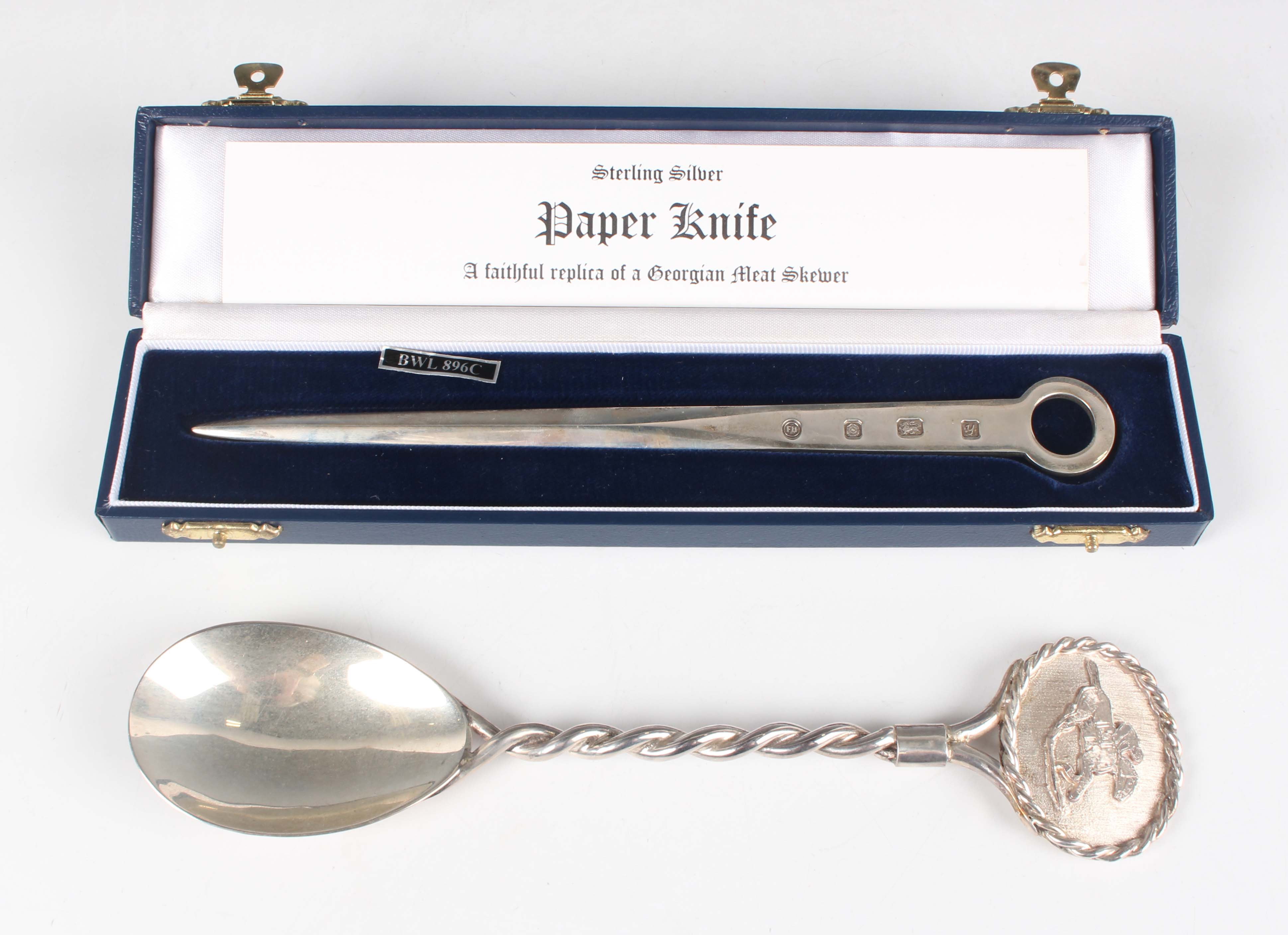 An Elizabeth II silver serving spoon, the cast terminal decorated in relief with a racehorse and jockey within a ropetwist border, London 2006 by CFL, length 22cm, and a paperknife in the form of a meat skewer, Sheffield 1998 by Francis Howard Ltd, length 21cm, cased, total weight 155.2g.