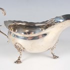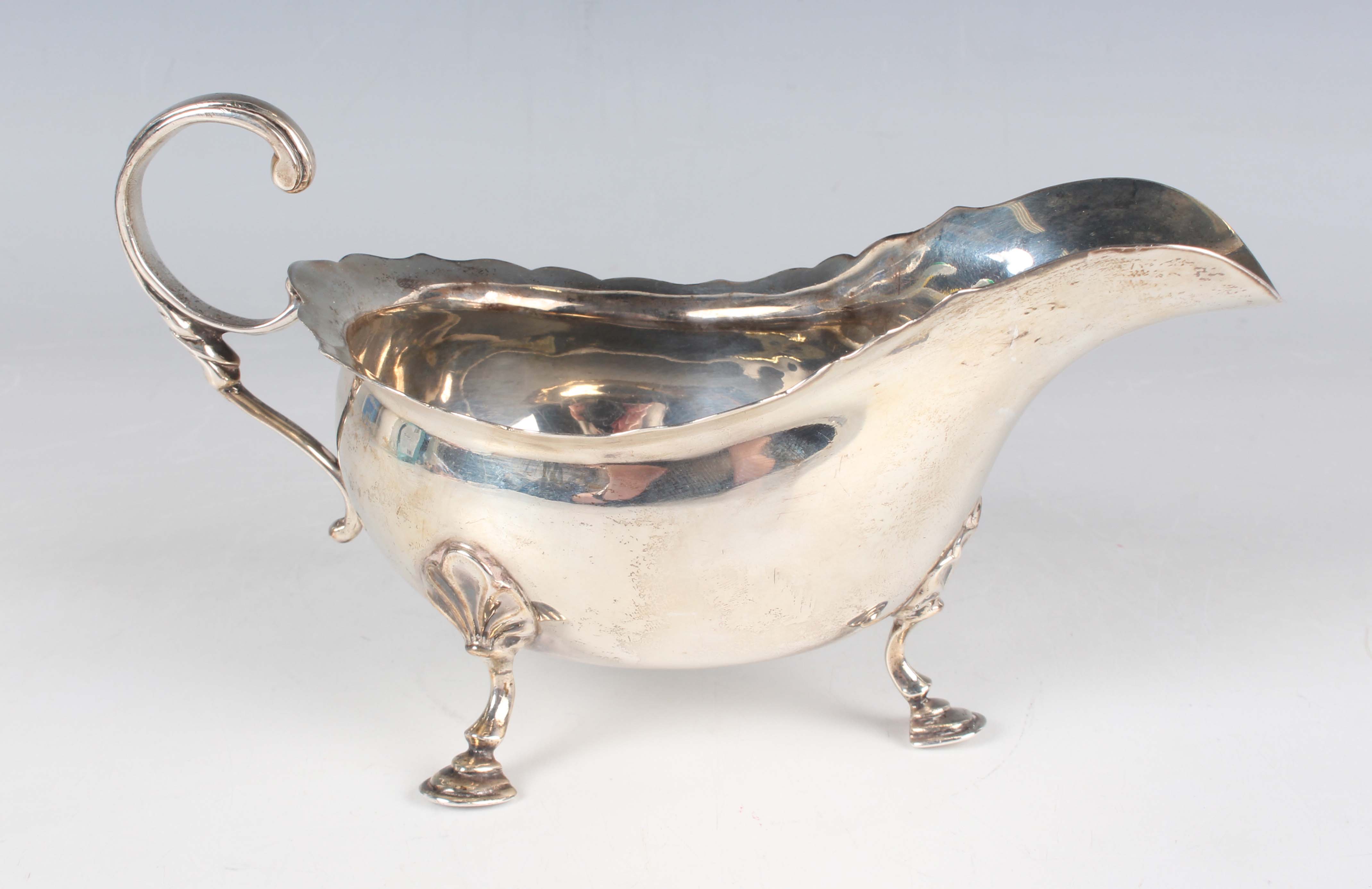 An Edwardian silver sauceboat with shaped rim and flying scroll handle, on scallop shell shouldered scroll legs terminating in hoof feet, London 1903 by Josiah Williams & Co, weight 138.1g, length 16.3cm. Provenance: formerly the property of Celia Johnson and Peter Fleming and thence by descent.