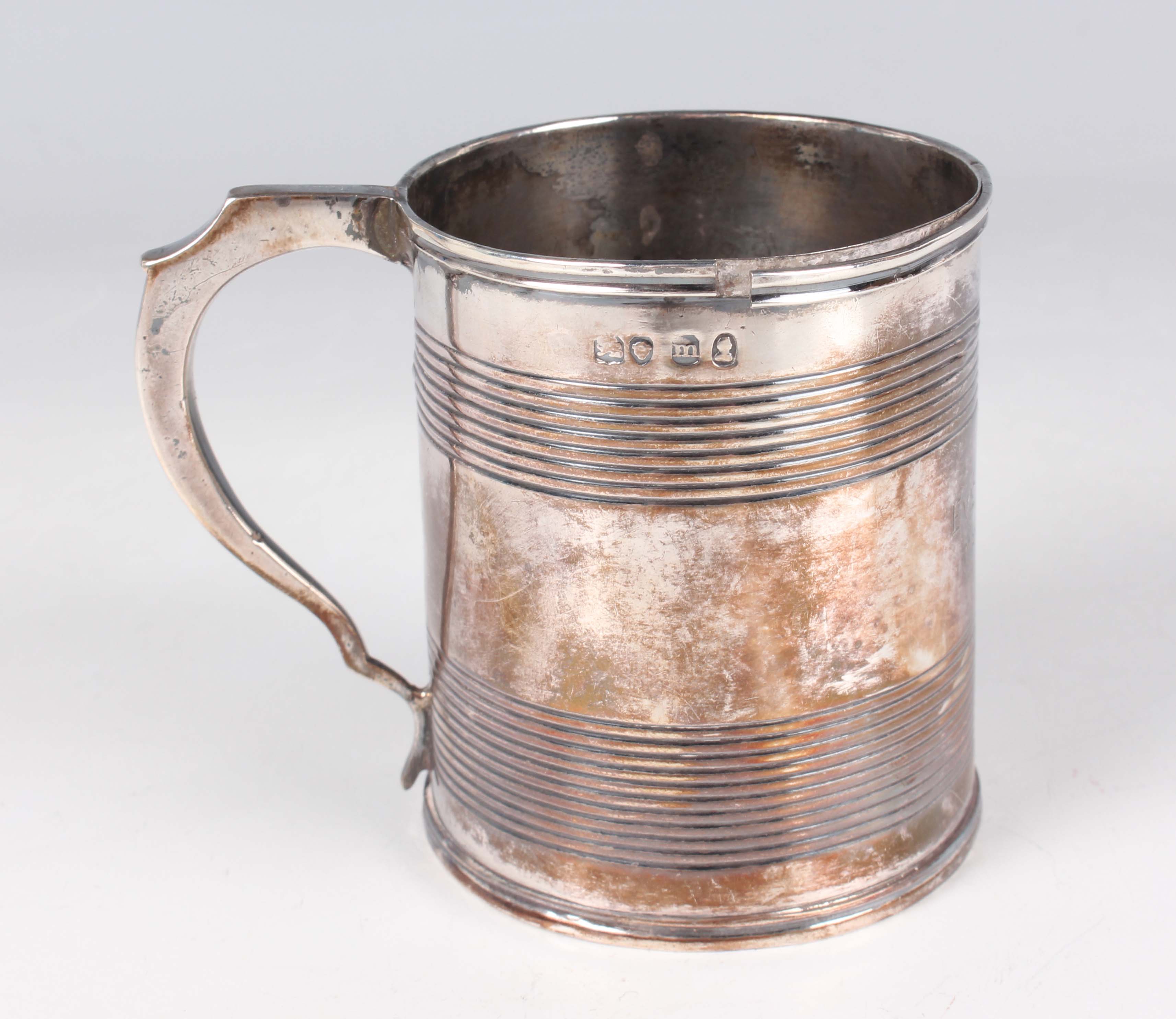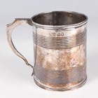 A George IV silver cylindrical christening tankard with scroll handle and horizontal reeded bands, London 1827, weight 101.4g, height 7.2cm (fault to rim). Provenance: formerly the property of Celia Johnson and Peter Fleming and thence by descent.