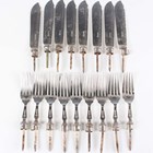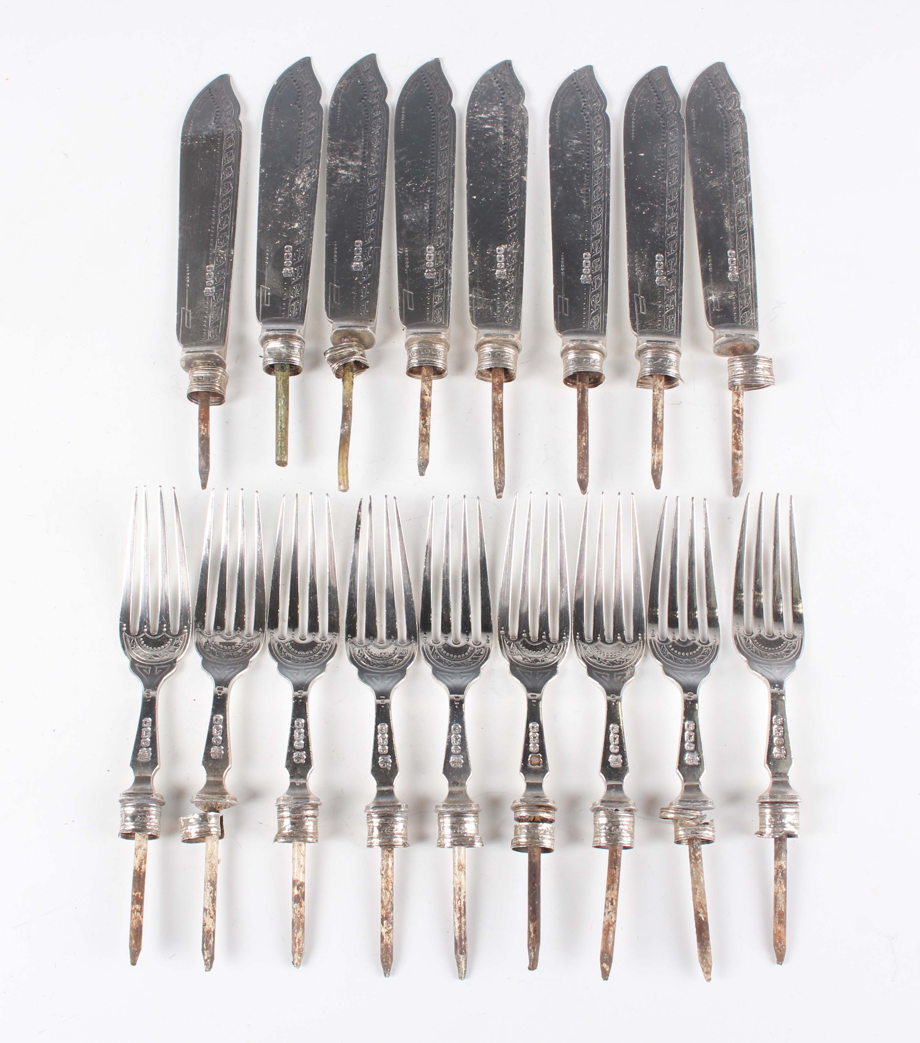 A set of eight late Victorian silver fish knives and nine matching fish forks with engraved decoration, Sheffield 1895 by Goldsmiths & Silversmiths Co, total weight 566.4g (lacking handles). Provenance: formerly the property of Celia Johnson and Peter Fleming and thence by descent.