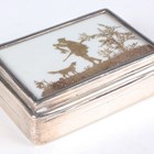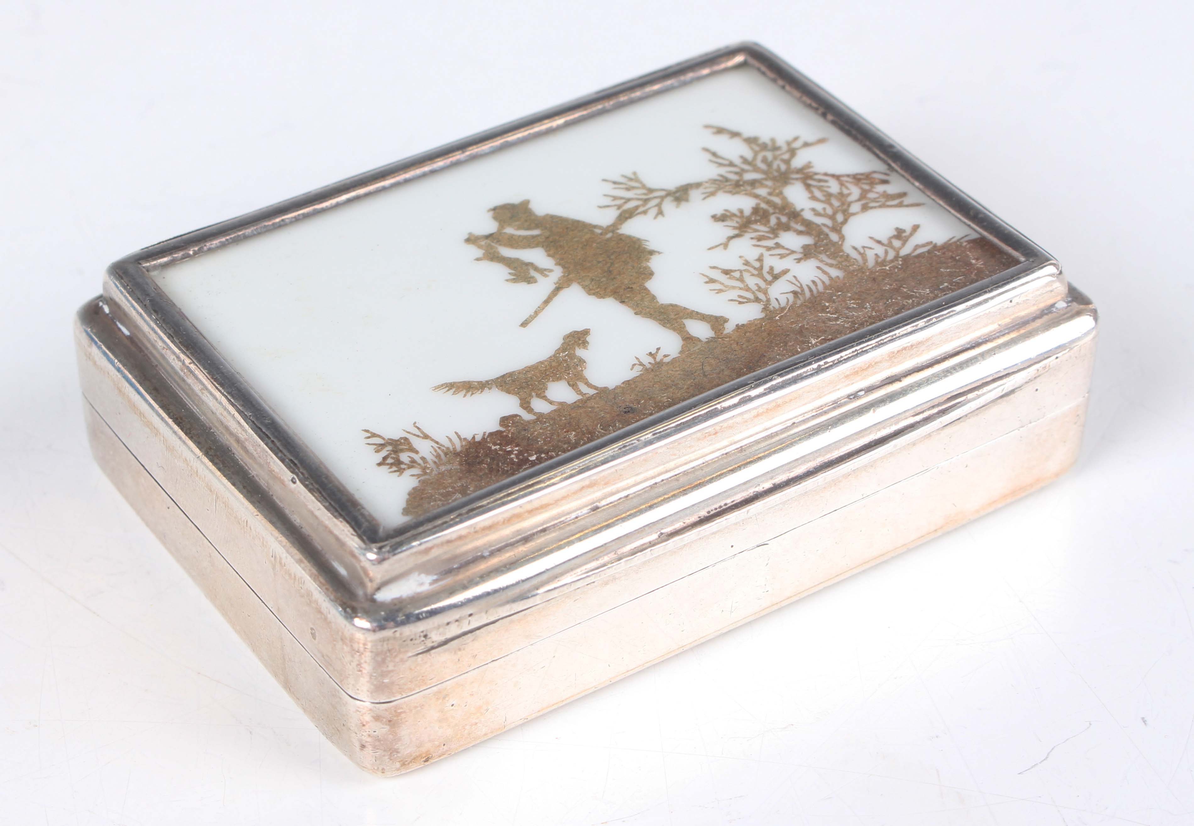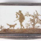 An Edwardian silver rectangular stamp box, the hinged lid inset with a glazed silhouette of a huntsman and dog standing on a grassy mound with bushes, revealing a twin stamp compartment, Chester 1907 by Colen Hewer Cheshire, weight including glass 114g, length 6.5cm.