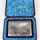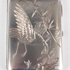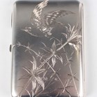 A late Victorian Aesthetic silver card case, the front and back engraved with a bird in flight and stems of bamboo against a matt textured ground, the interior fitted with taupe coloured leather compartments, London 1885 by Alfred Hall & John Goode, weight including interior 107.2g, length 10cm, with a fitted case.