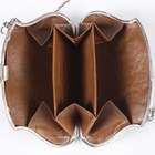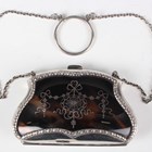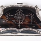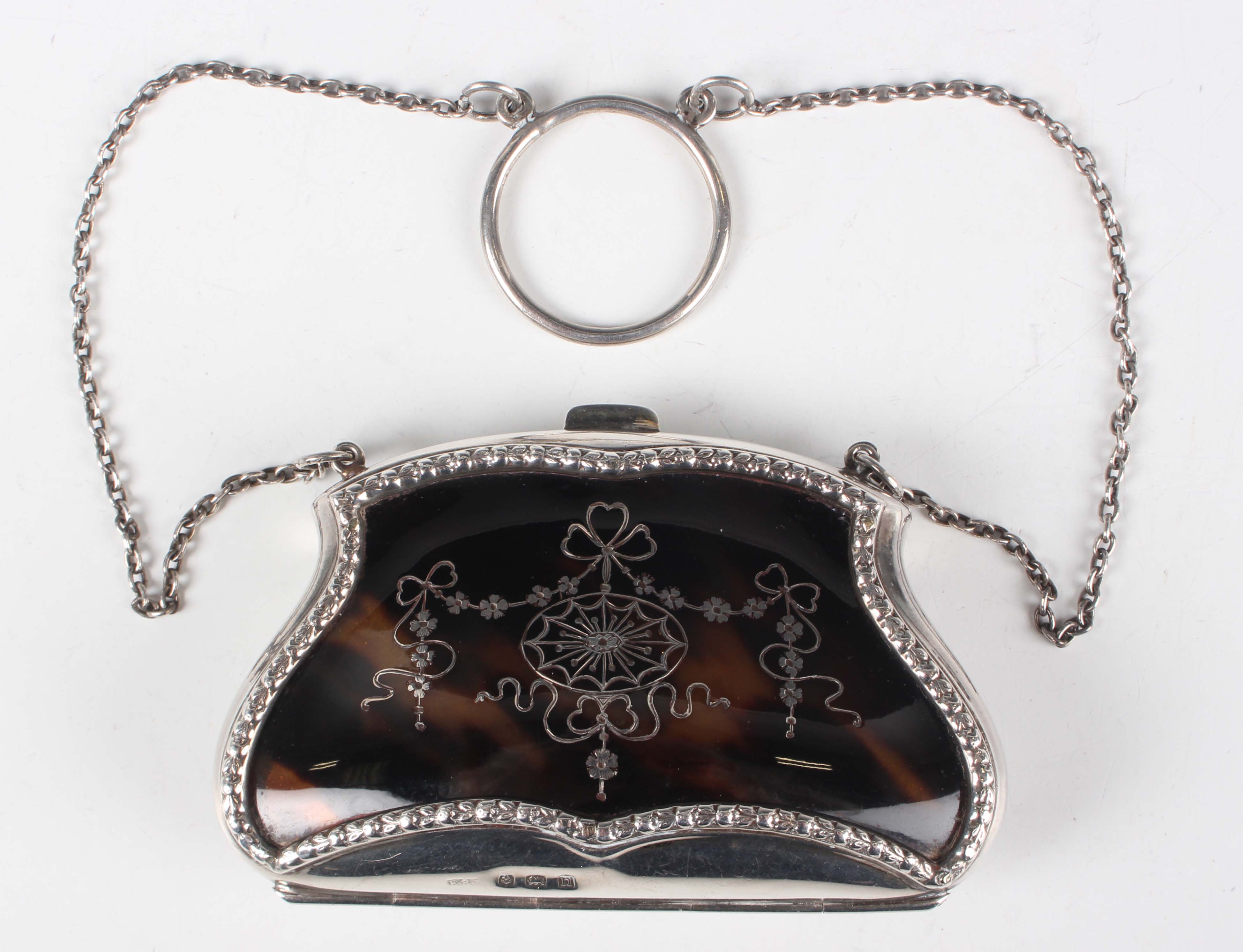 A George V silver and tortoiseshell evening purse, the front inset with a tortoiseshell panel, piqué inlaid with a floral and ribbon pendant garland, the back inset with a plain tortoiseshell panel, both framed by a bellflower surround, fitted with a carrying chain, the interior with dark tan leather compartments, Birmingham 1912 by E.S. Barnsley & Co, width 9.3cm, total length 24.5cm.