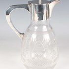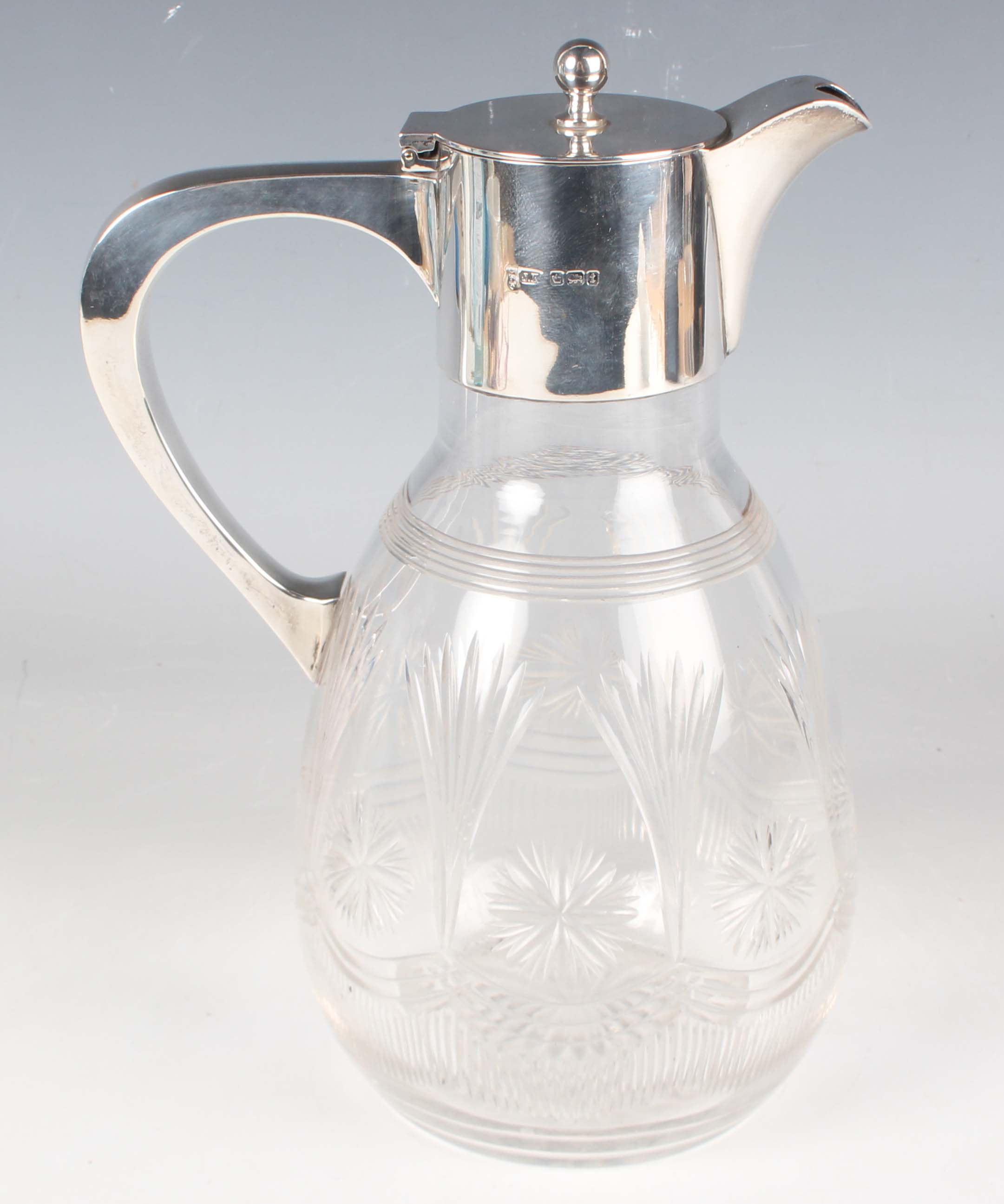 A George V silver mounted cut glass claret jug, the cylindrical neck with hinged lid and ball finial above a pouring spout and scroll handle, the ovoid cut glass body with star and fan decoration, Sheffield 1911 by Joseph Rodgers & Sons, height 22.5cm.