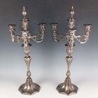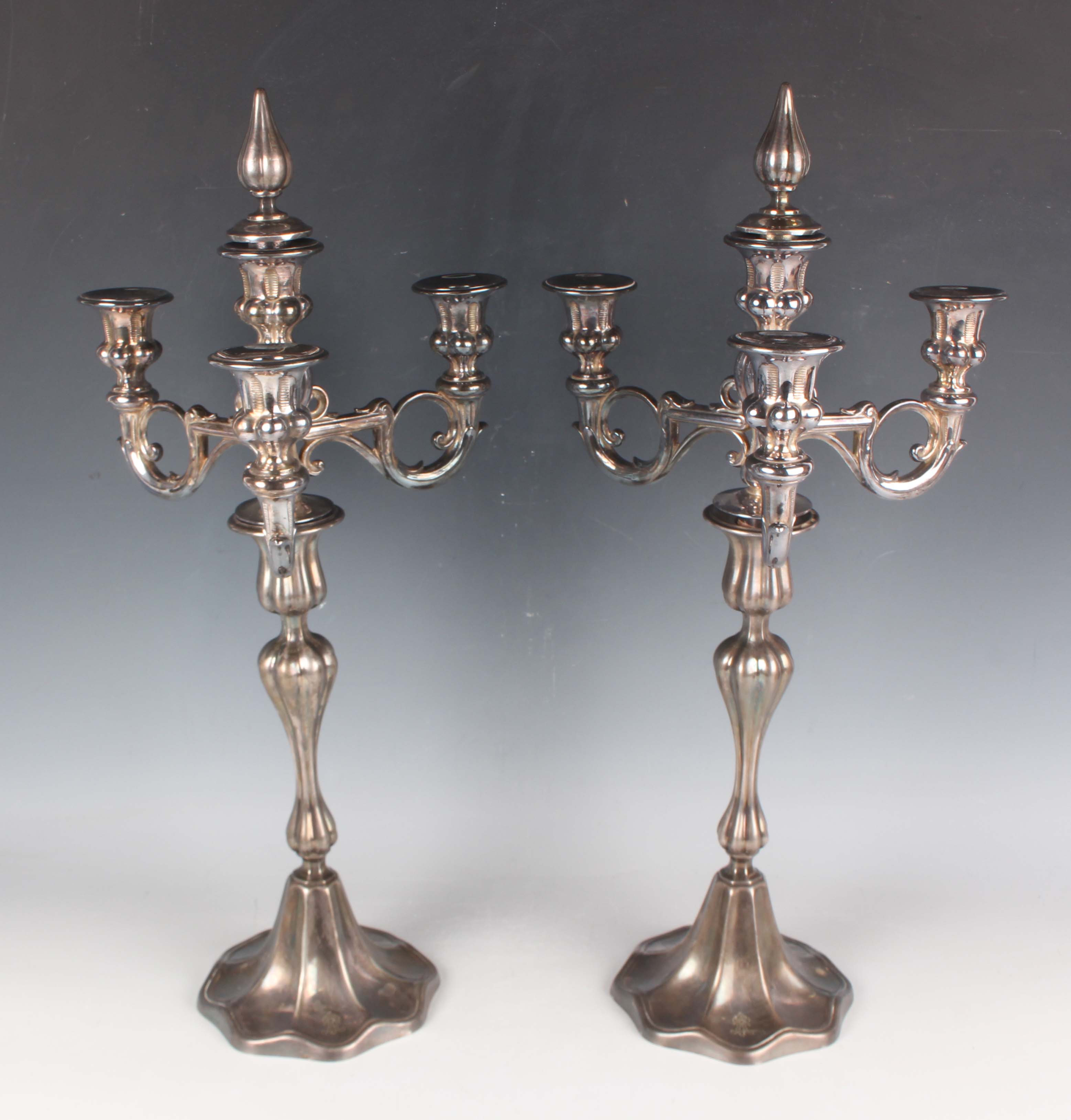 A pair of Austrian plated four-light three-scroll branch candelabra, each with urn shaped sconces above baluster reeded stem and a flared petal rimmed foot, by Art.Krupp Berndorf, height 49cm.