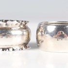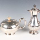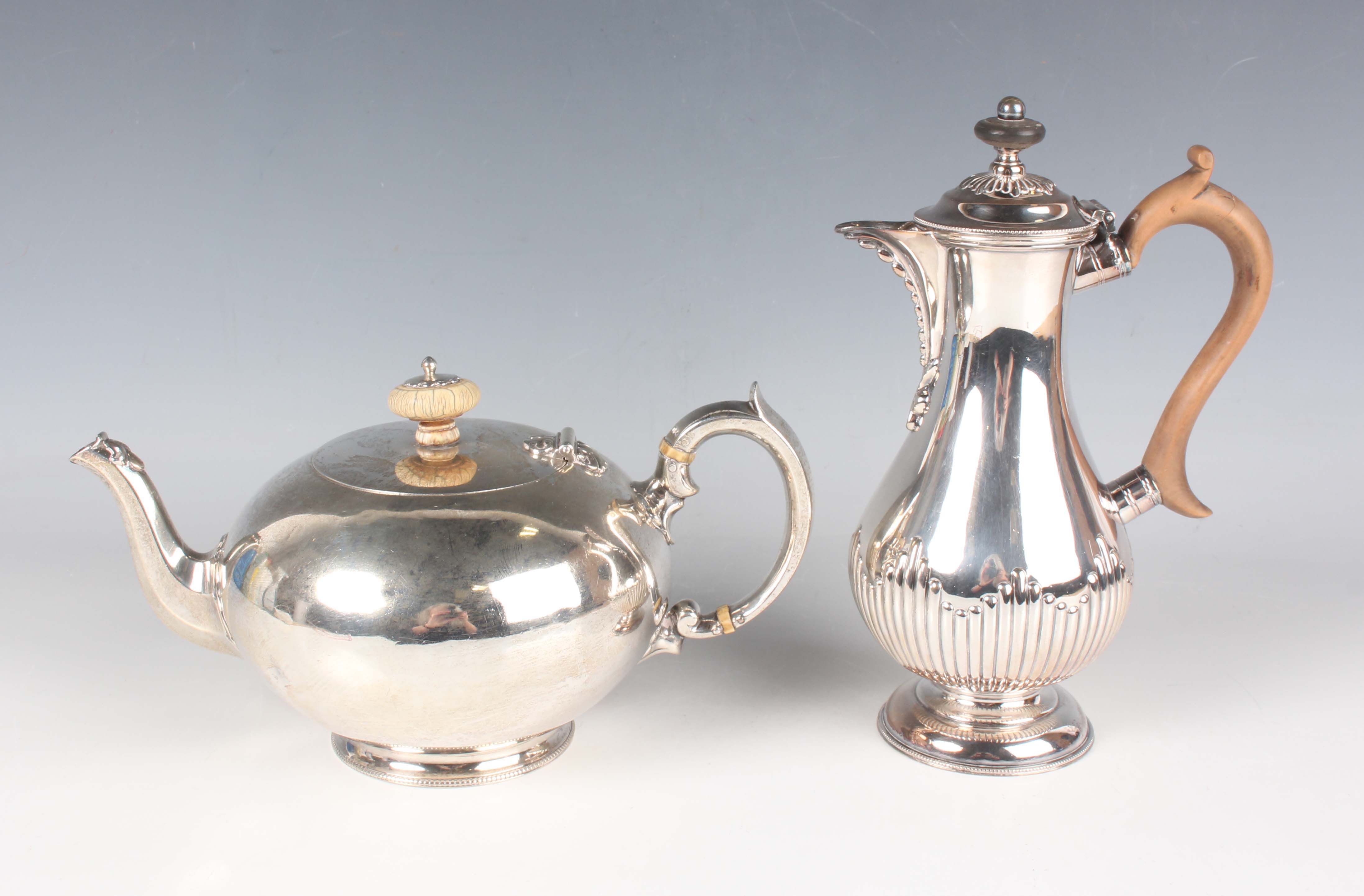 A Victorian silver teapot of squat circular form with faceted scroll spout and handle, on a circular foot, London 1864 by Samuel H. Hayne, length 24cm, and two silver napkin rings, total weight 569g, together with a plated half-reeded hot water pot. Note: a non-transferrable ivory exemption certificate has been granted for the sale of this item.