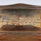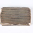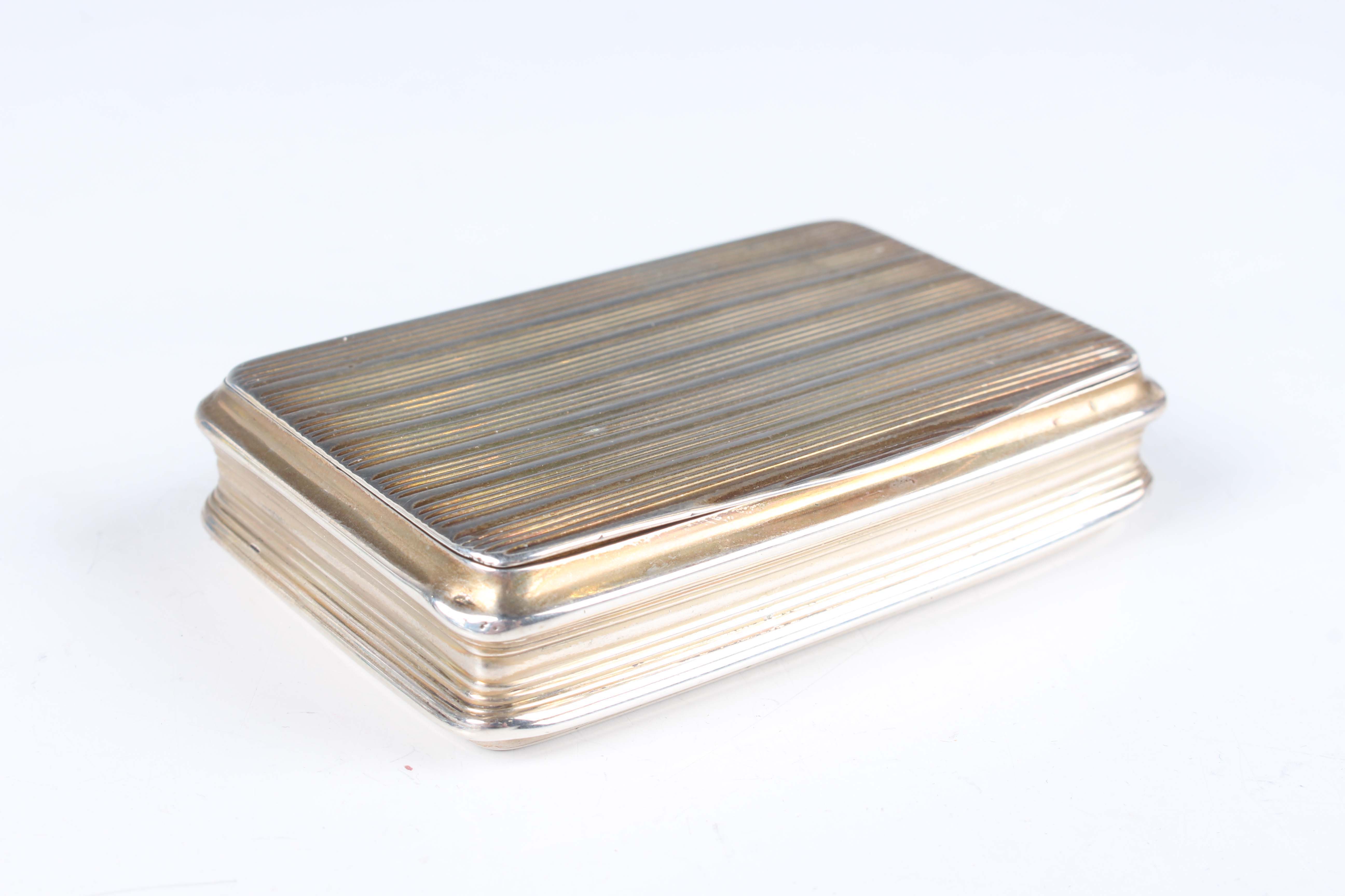 A George III silver rectangular snuff box with engine turned banded decoration, the hinged lid interior presentation inscribed 'To Capt William Blaine of the Brig Recovery of Shields in grateful remembrance of his humanity on the 15 Oct 1820 from Rd Alridge, T.J Culliford, F.W Appath, C. Snooke', Birmingham 1820 by John Shaw, weight 91.7g, length 7.8cm.