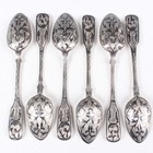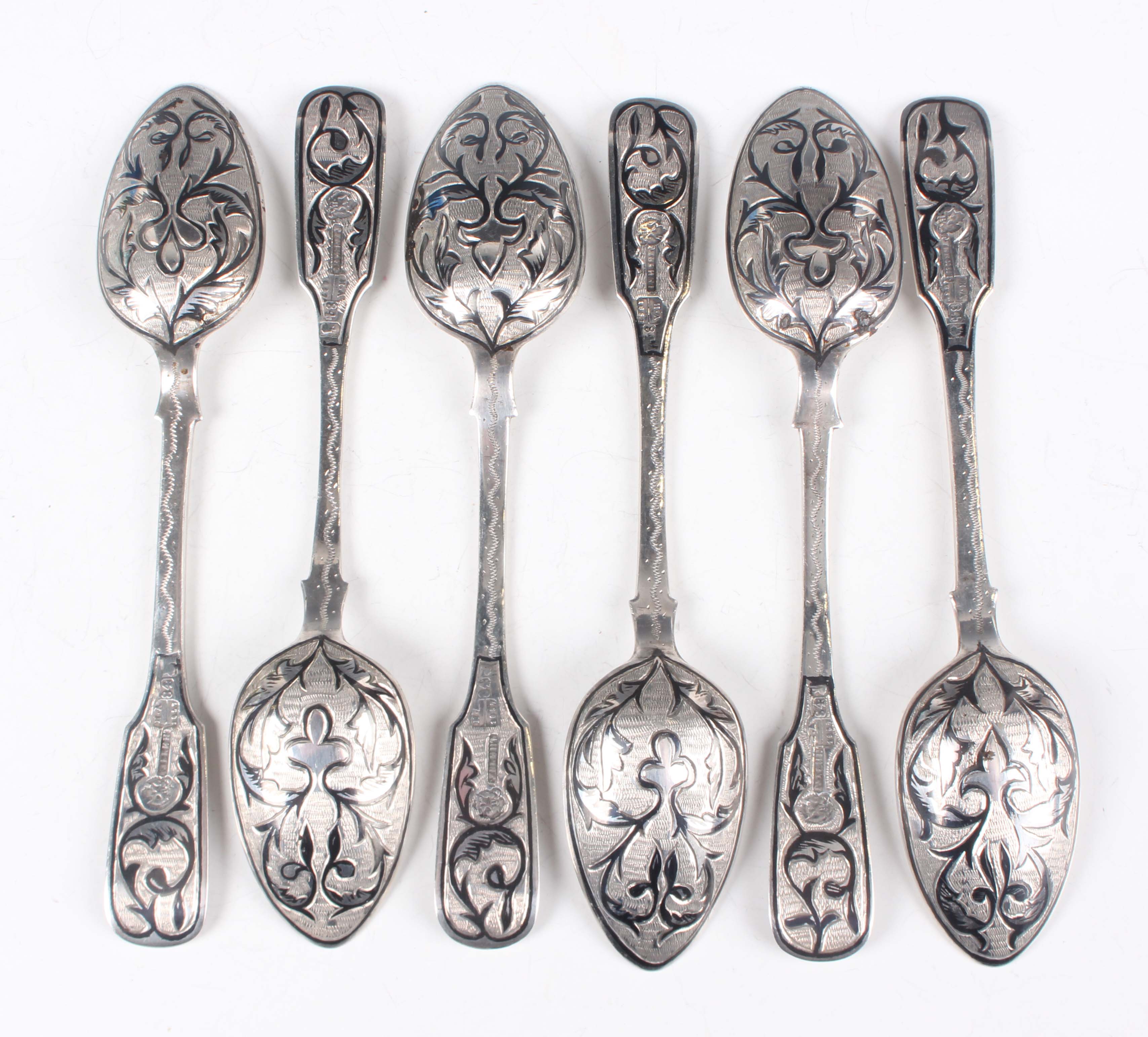 A set of six mid-19th century Russian silver and niello work Fiddle pattern teaspoons, 84 zolotnik, each decorated with foliate scrolls, Moscow 1857 by Ivan Semenovich Gubkin, total weight 138g, length 14.5cm.