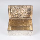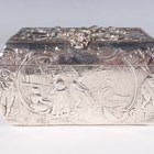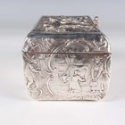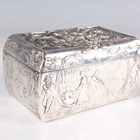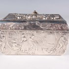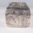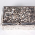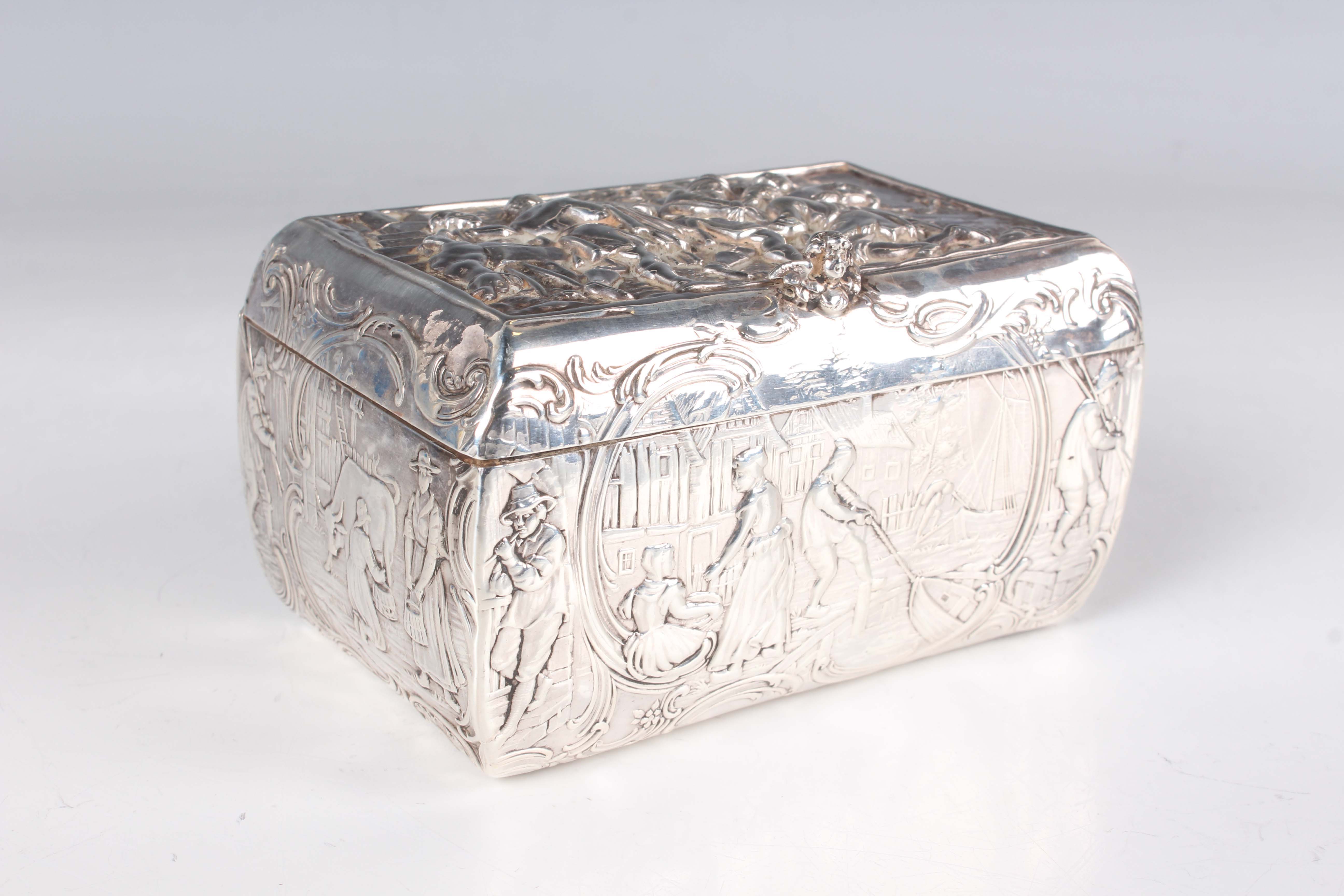 A Dutch silver trinket box of rectangular form, the hinged lid embossed with a figural scene and castle beyond, the sides decorated with rural scenes of boats, figures, farm animals and dwellings, weight 200.6g, length 11.5cm, height 6.3cm.