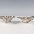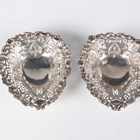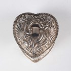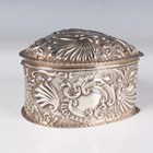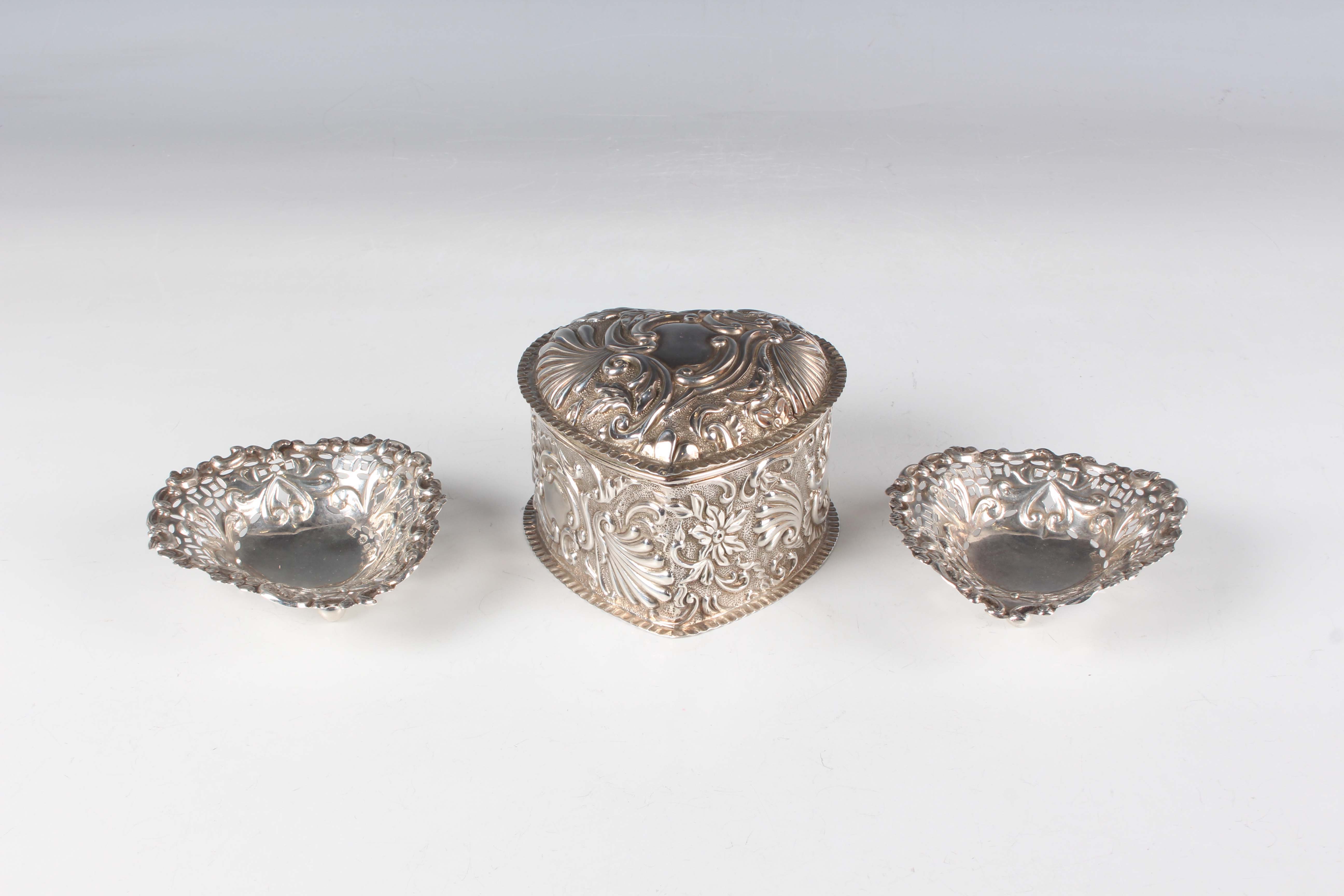 A Victorian silver heart shaped trinket box, the domed hinged lid and sides embossed with vacant scroll cartouche within scrolling leaves and stylized scallop shells, against a stippled ground, Birmingham 1890 by Deakin & Francis, height 6.2cm, and a pair of silver heart shaped bonbon dishes with pierced and embossed sides, raised on ball feet, Birmingham 1895 by Thomas Hayes, length 9cm, total weight 154.4g.