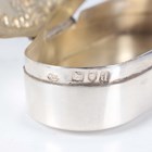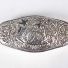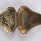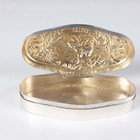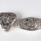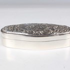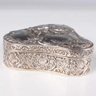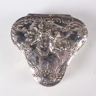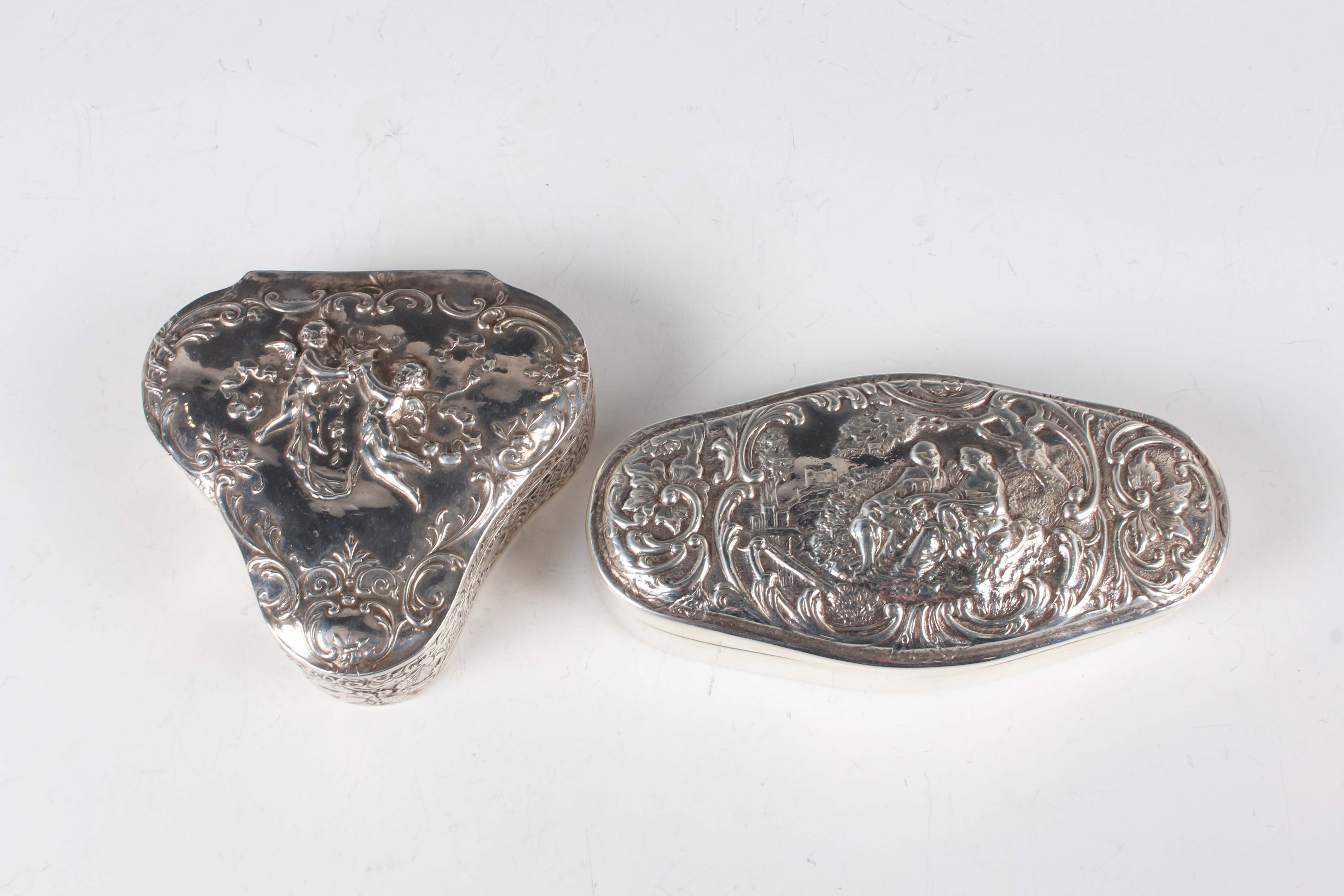 An Edwardian silver trinket box of trilobed outline, the hinged lid decorated in relief with two cherubs framed by scrolls above chased sides decorated with doves, amongst lattice and 'C' scrolls, import mark Chester 1901 by Berthold Muller, length 7.7cm, and a silver shaped oval trinket box, the hinged lid relief decorated with a lady and gentleman seated in a garden framed by foliate scrolls, London 1899 by William Comyns & Sons, length 11cm, total weight 185.6g.
