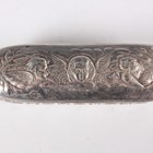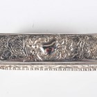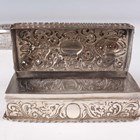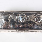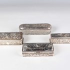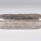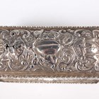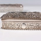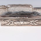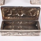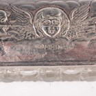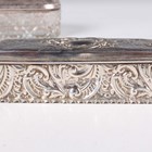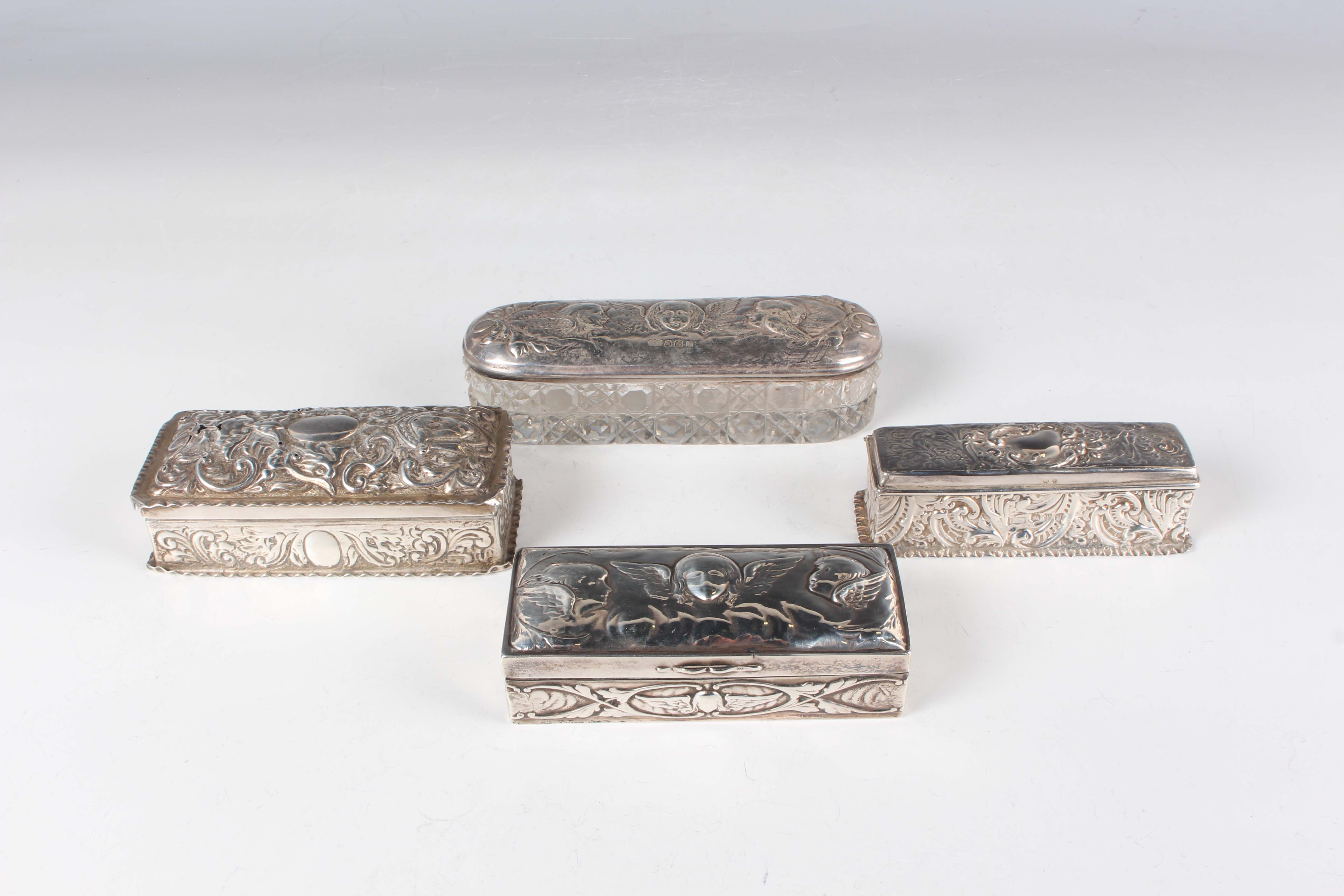 A group of three silver embossed rectangular trinket boxes, comprising one decorated with amorini and foliate scrolls, London 1905 by William Comyns & Sons, length 10.3cm, one decorated with foliate scrolls, Chester 1898 by Hilliard & Thomason, length 10cm, and one decorated with masks and scrolls, London 1891, length 11cm, together with a silver and cut glass trinket box, the lid decorated with amorini, Birmingham 1907 by Deakin & Francis, length 13.5cm, total weight excluding glass 256.6g.
