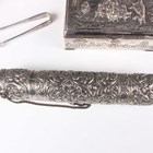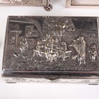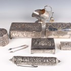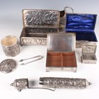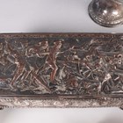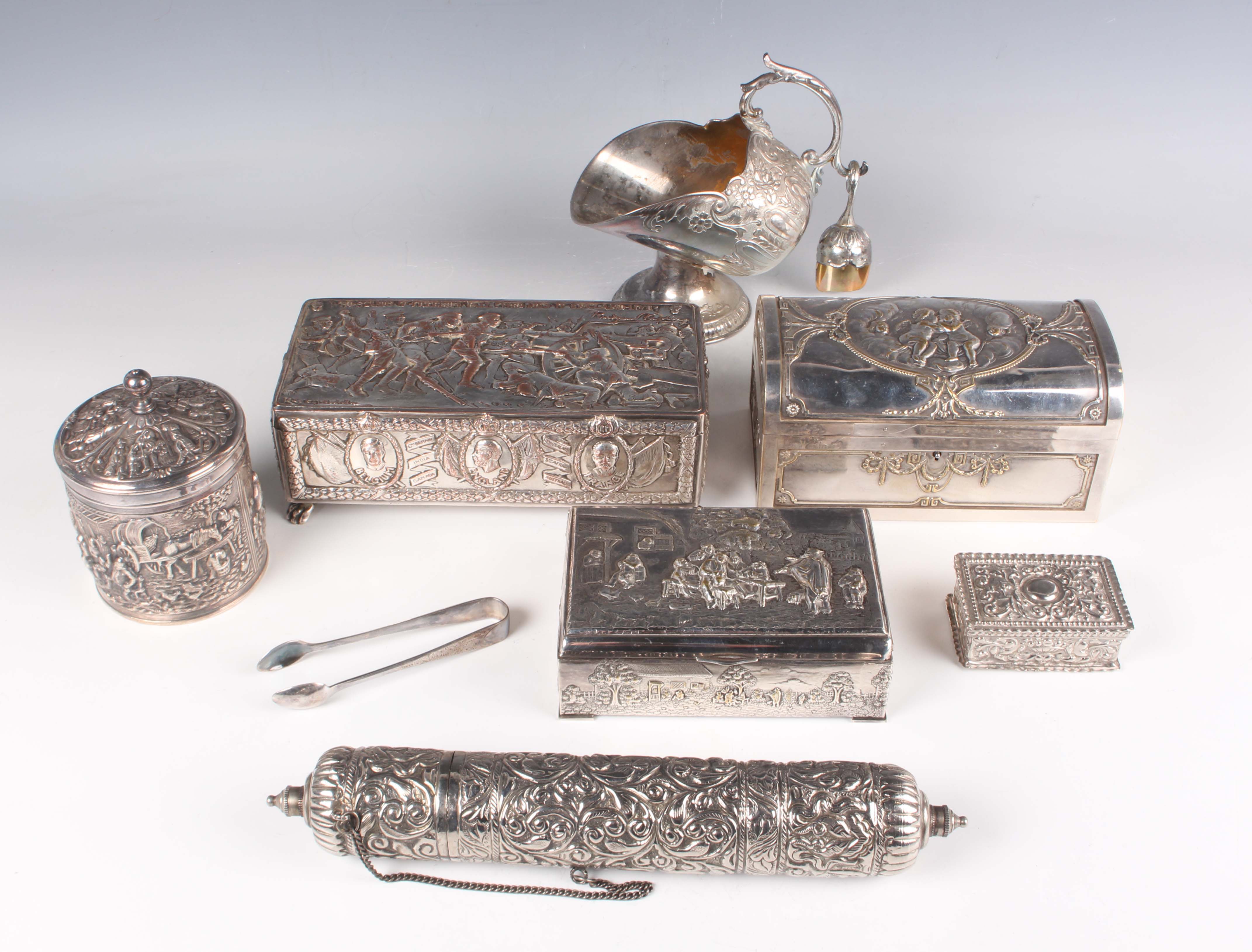 An early 20th century First World War period plated on copper rectangular box, the hinged lid decorated in relief with British infantryman charging a German gun beneath Kipling's 'Who stands if Freedom fall, Who dies if England Live?', with facsimile Kipling signature to right corner and 'R. Caton Woodville' facsimile signature to left corner, the sides with the allied nations, length 20cm, together with a small collection of assorted plated items.