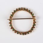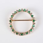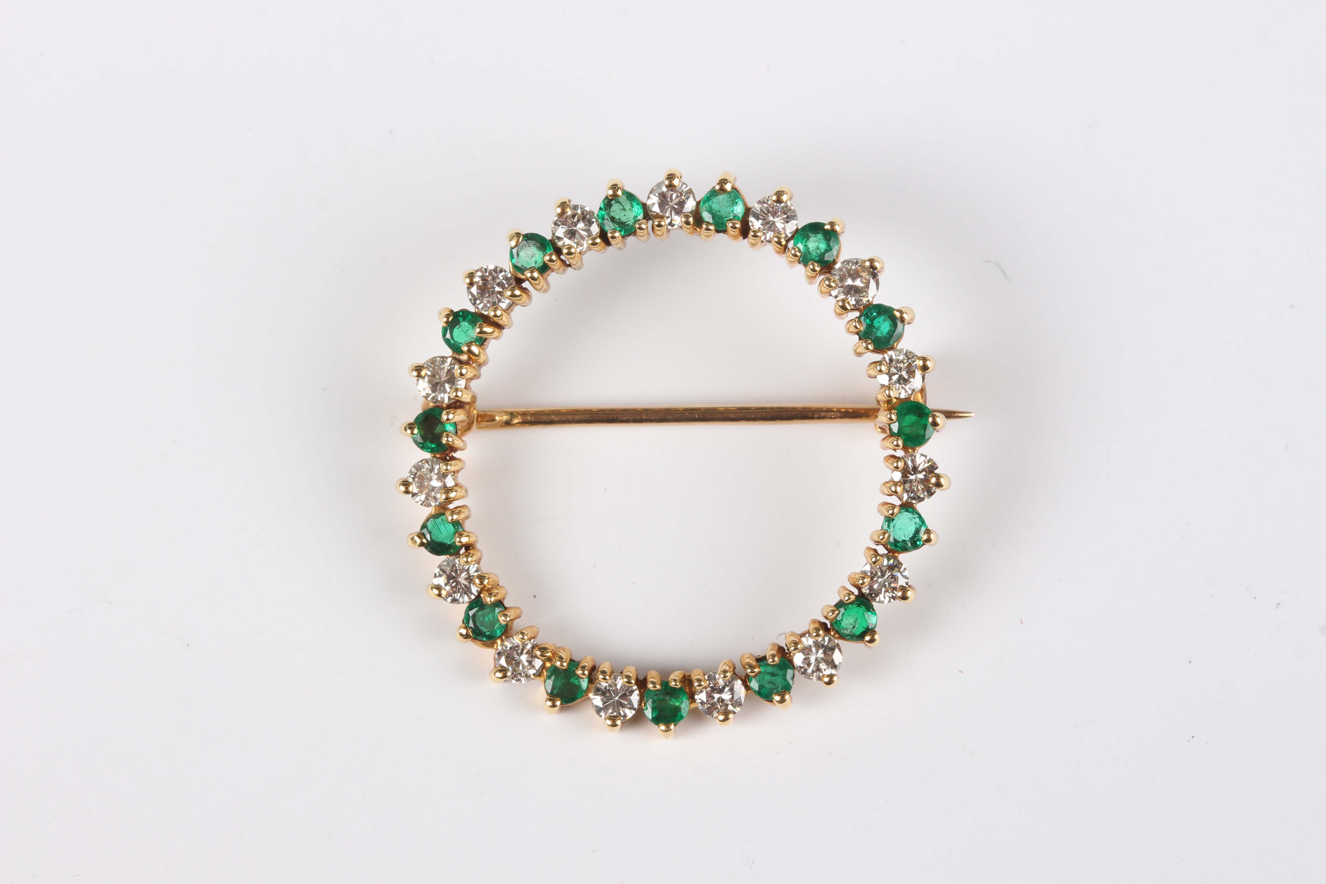 An 18ct gold, emerald and diamond brooch in a circular openwork design, mounted with alternating circular cut emeralds and diamonds, London 1976, weight 5g, diameter 2.8cm.