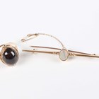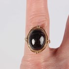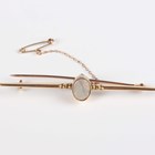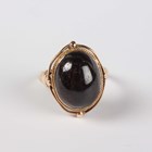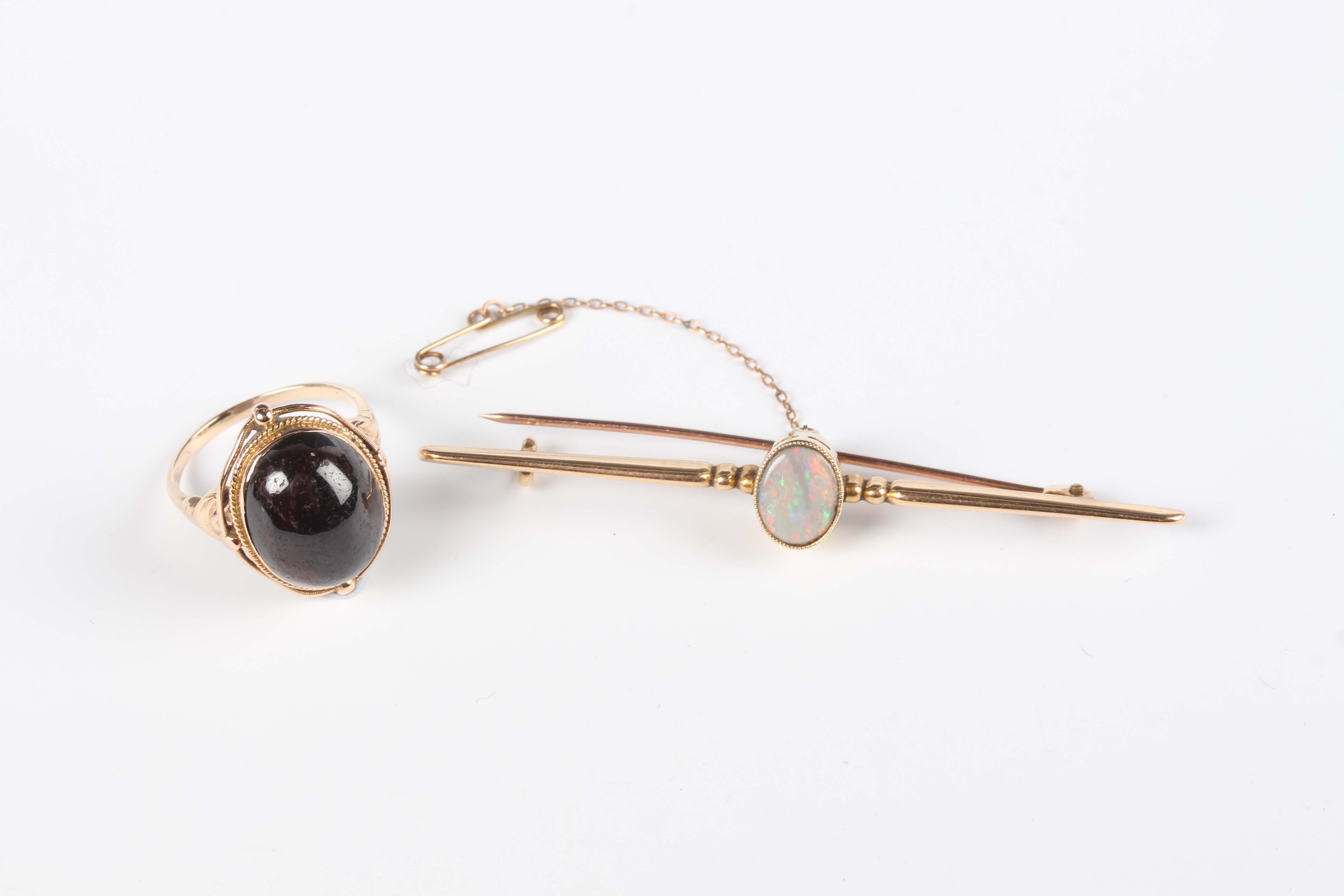 A gold ring, mounted with an oval carbuncle garnet between foliate shoulders, detailed ‘10K’, weight 4.8g, ring size approx K1/2, and a gold and opal single stone bar brooch, detailed ‘15’, fitted with a safety chain, weight 2.7g, width 6.3cm.