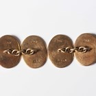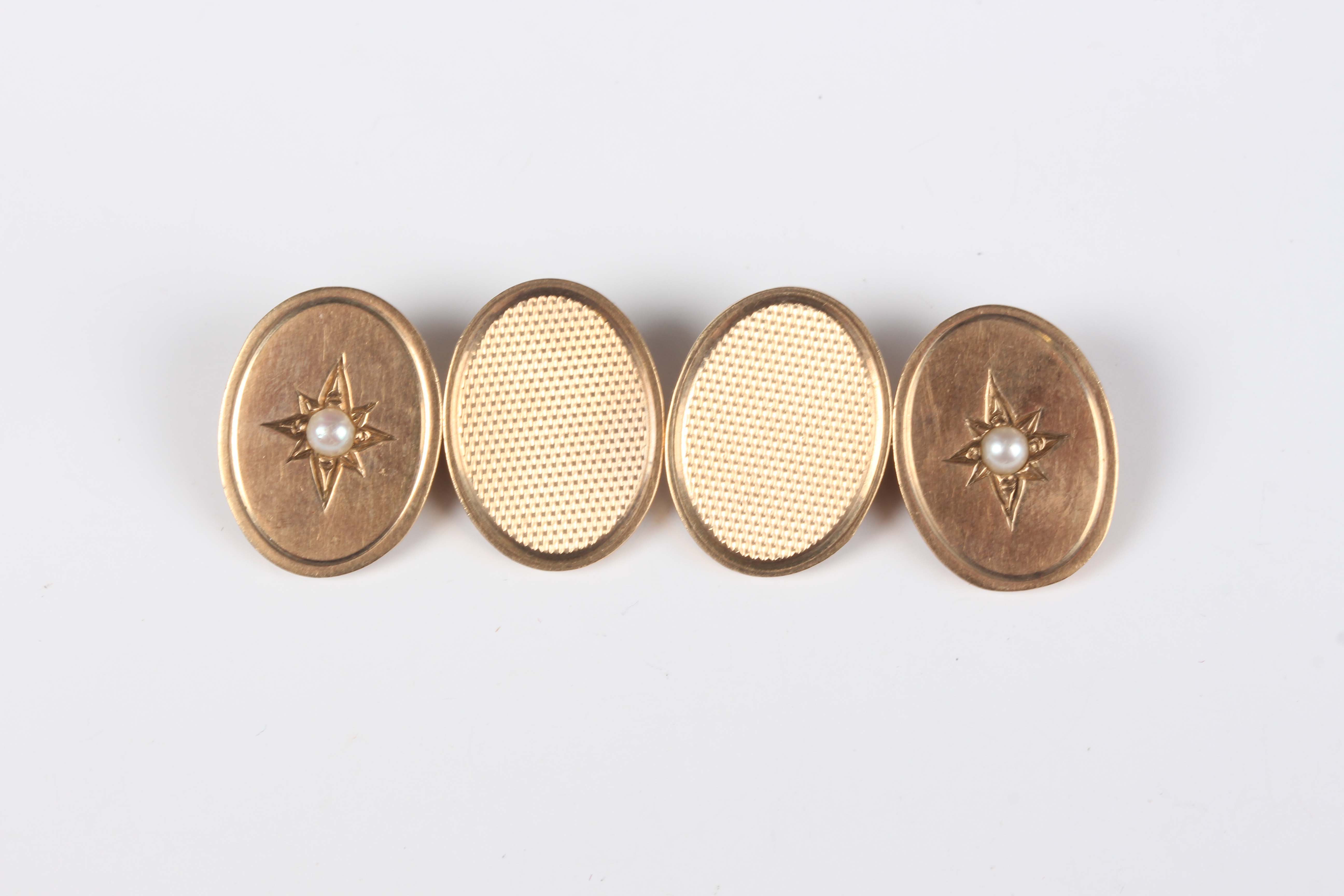 A pair of 9ct gold and half-pearl set oval cufflinks, each front mounted with a single half-pearl within a star shaped surround, each back engine turned, Birmingham 1977, weight 11.4g, dimensions of each front 1.8cm x 1.4cm.
