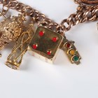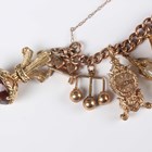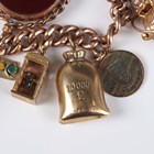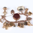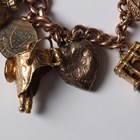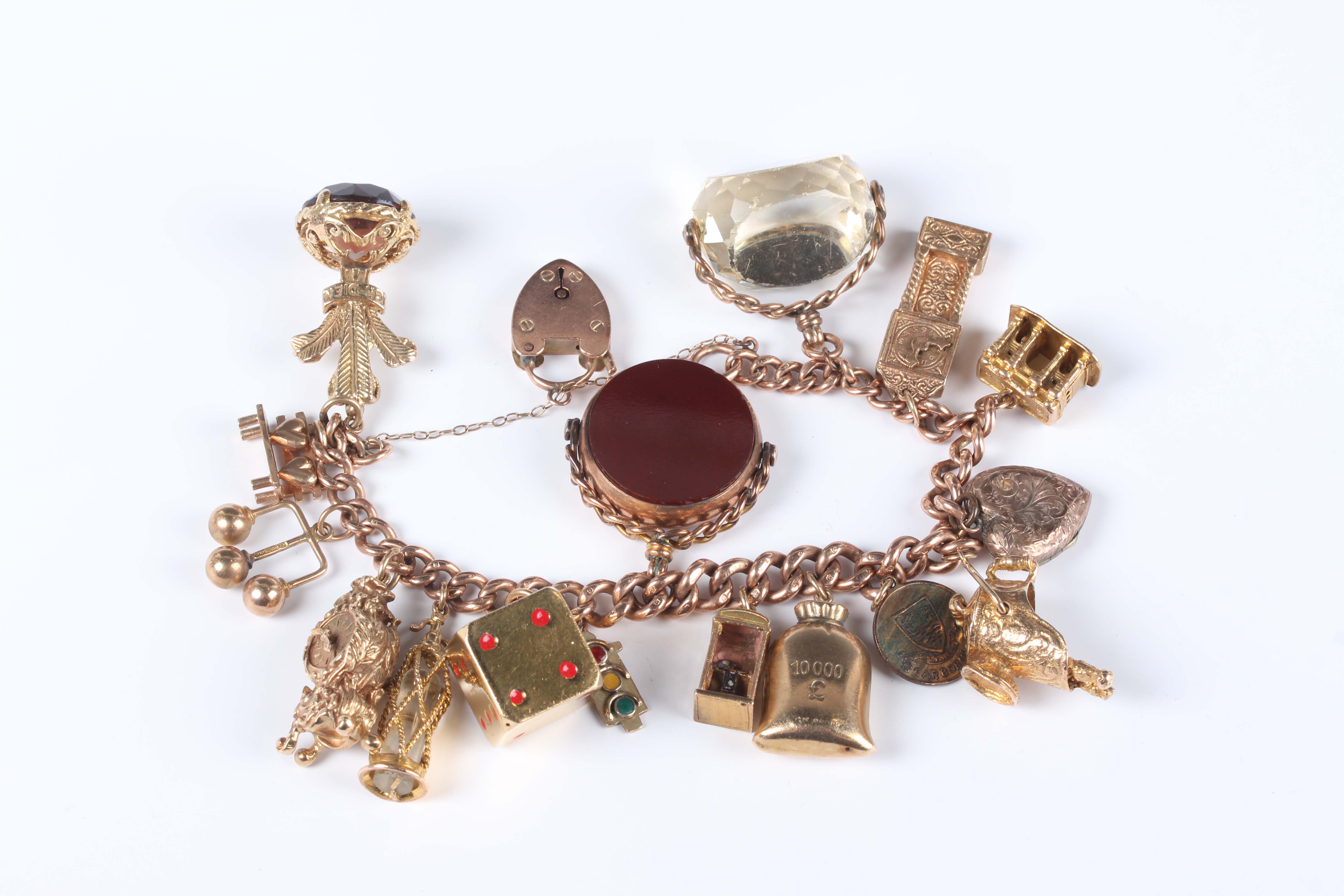 A 9ct gold curblink charm bracelet on a 9ct gold heart shaped padlock clasp, fitted with eleven 9ct gold and gold mounted charms, including a longcase clock and a gold Scarborough charm, detailed ‘9ct’, a gilt metal heart shaped locket and three further charms, all unmarked, total weight 100g.