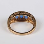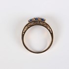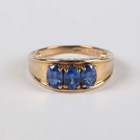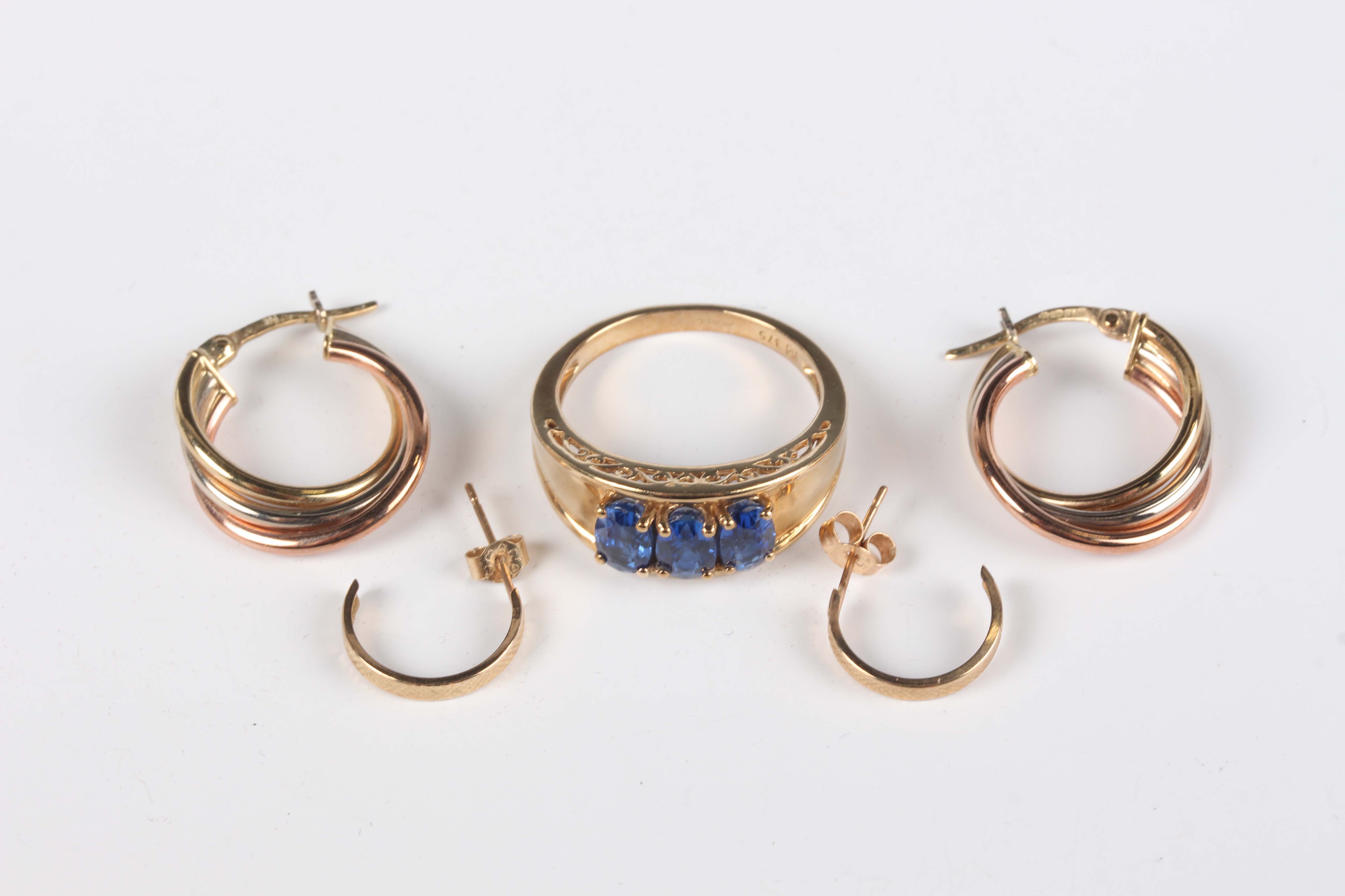 A 9ct gold and blue kyanite ring, claw set with a row of oval cut blue kyanites, London 2010, ring size approx P1/2, a pair of 9ct three colour gold hoop shaped earrings, total weight 6g, and another pair of gold hoop shaped earrings, unmarked, weight 0.3g.