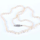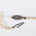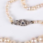 A single row necklace of cultured pearls on a 9ct white gold, sapphire and diamond set boat shaped clasp, Birmingham 1965, length 50.5cm.