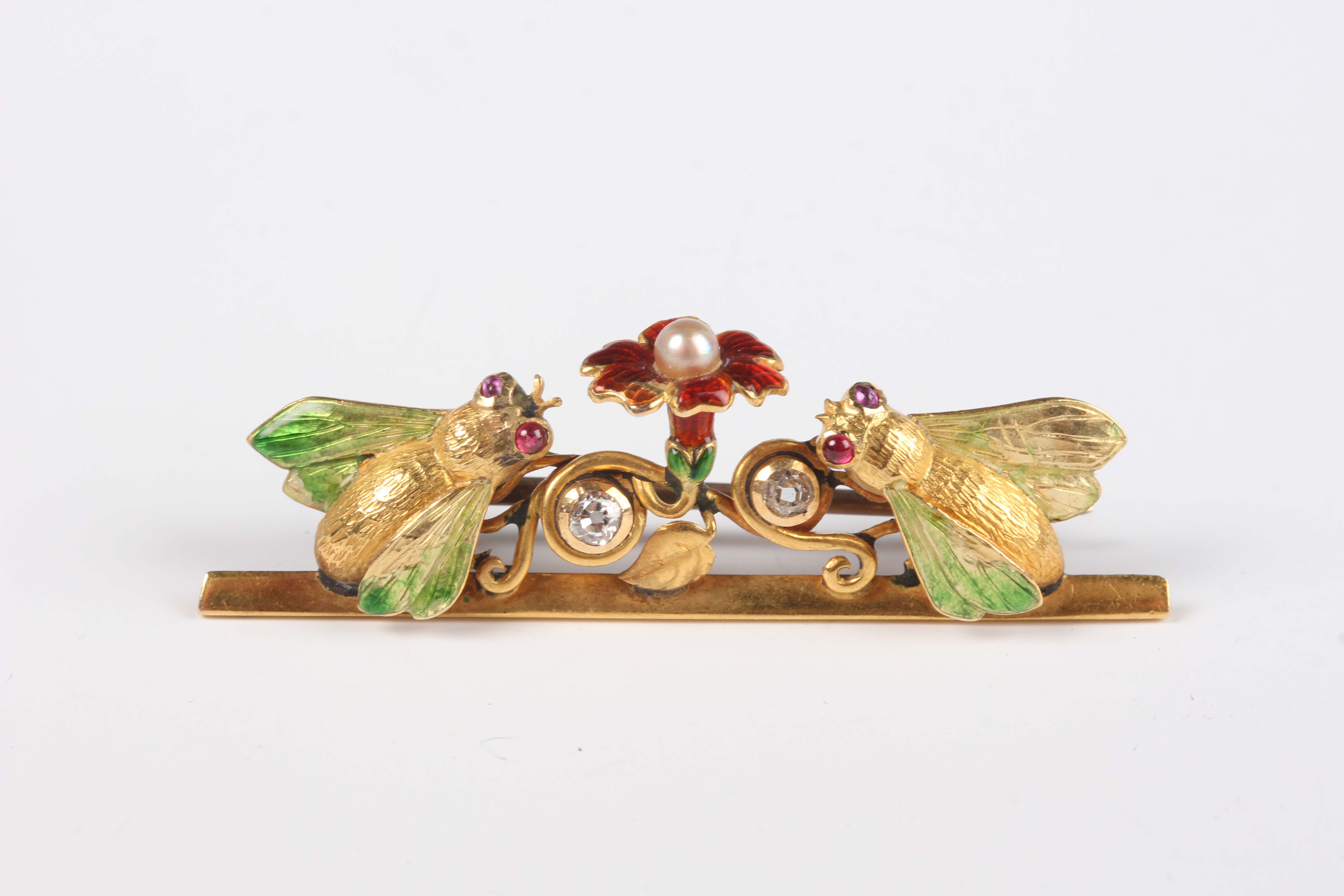 An early 20th century gold, diamond, ruby, seed pearl and enamelled bar brooch, designed as two insects either side of a flower, unmarked, weight 7.1g, width 4.2cm.