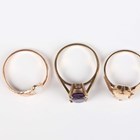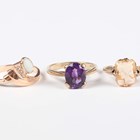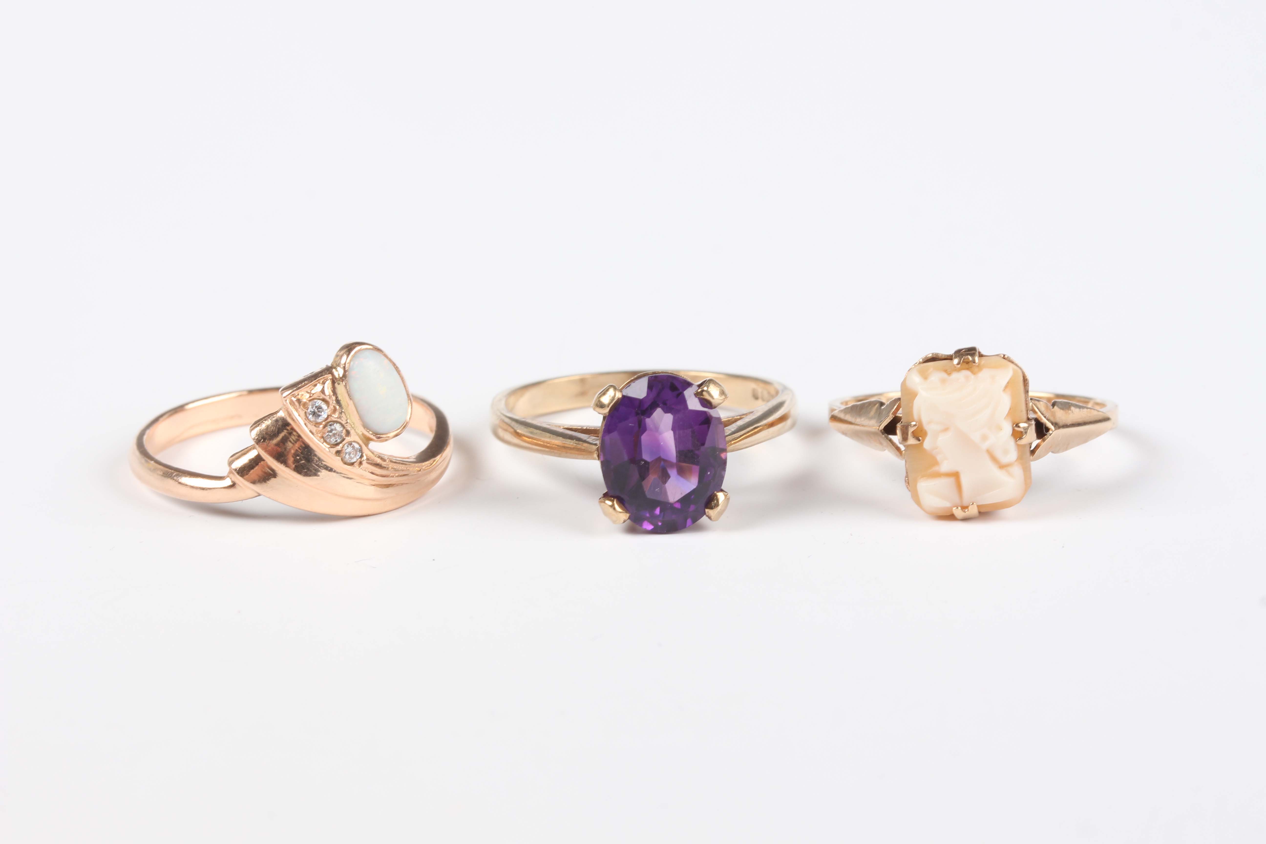 A gold ring, mounted with an oval opal and three colourless gemstones, detailed ‘585’, weight 2.4g, ring size approx Q1/2, a 9ct gold ring, claw set with an oval cut amethyst, ring size approx P, and a 9ct gold and shell cameo ring, carved as a portrait of a lady, total weight 4.4g.