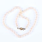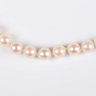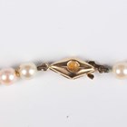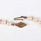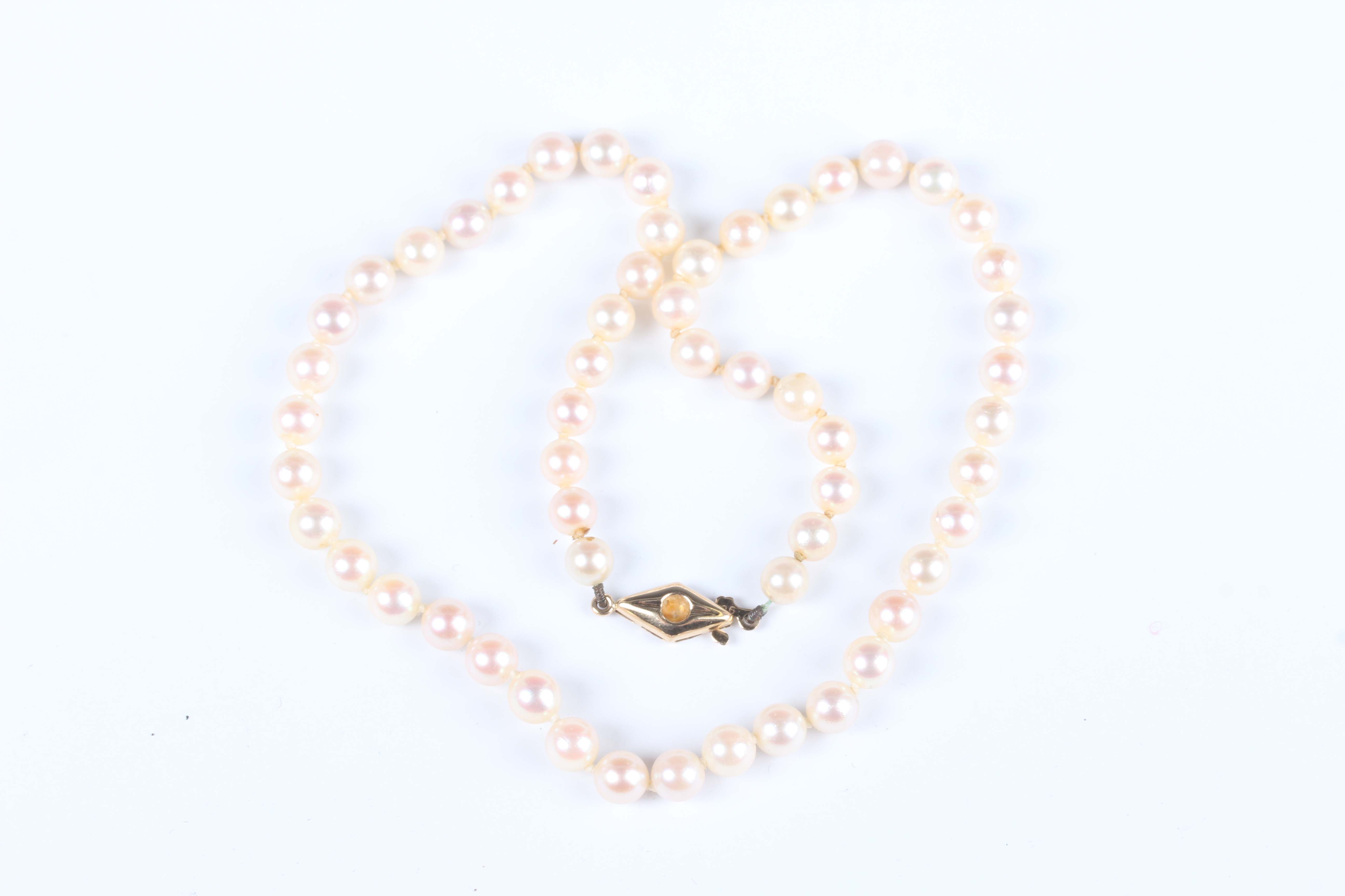 A single row necklace of uniform cultured pearls on 9ct gold lozenge shaped clasp, length 37.5cm (clasp lacking cultured pearl).