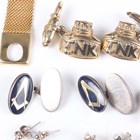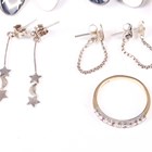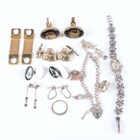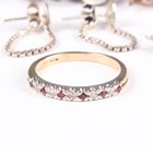 A 9ct gold, ruby and diamond half eternity ring, Birmingham 1988, weight 1.8g, ring size approx L, a silver twin curblink charm bracelet on a silver heart shaped padlock clasp, fitted with five charms, a pair of silver Masonic cufflinks, a lady’s marcasite bracelet watch and five further items.