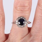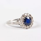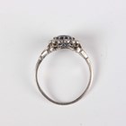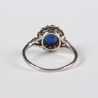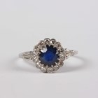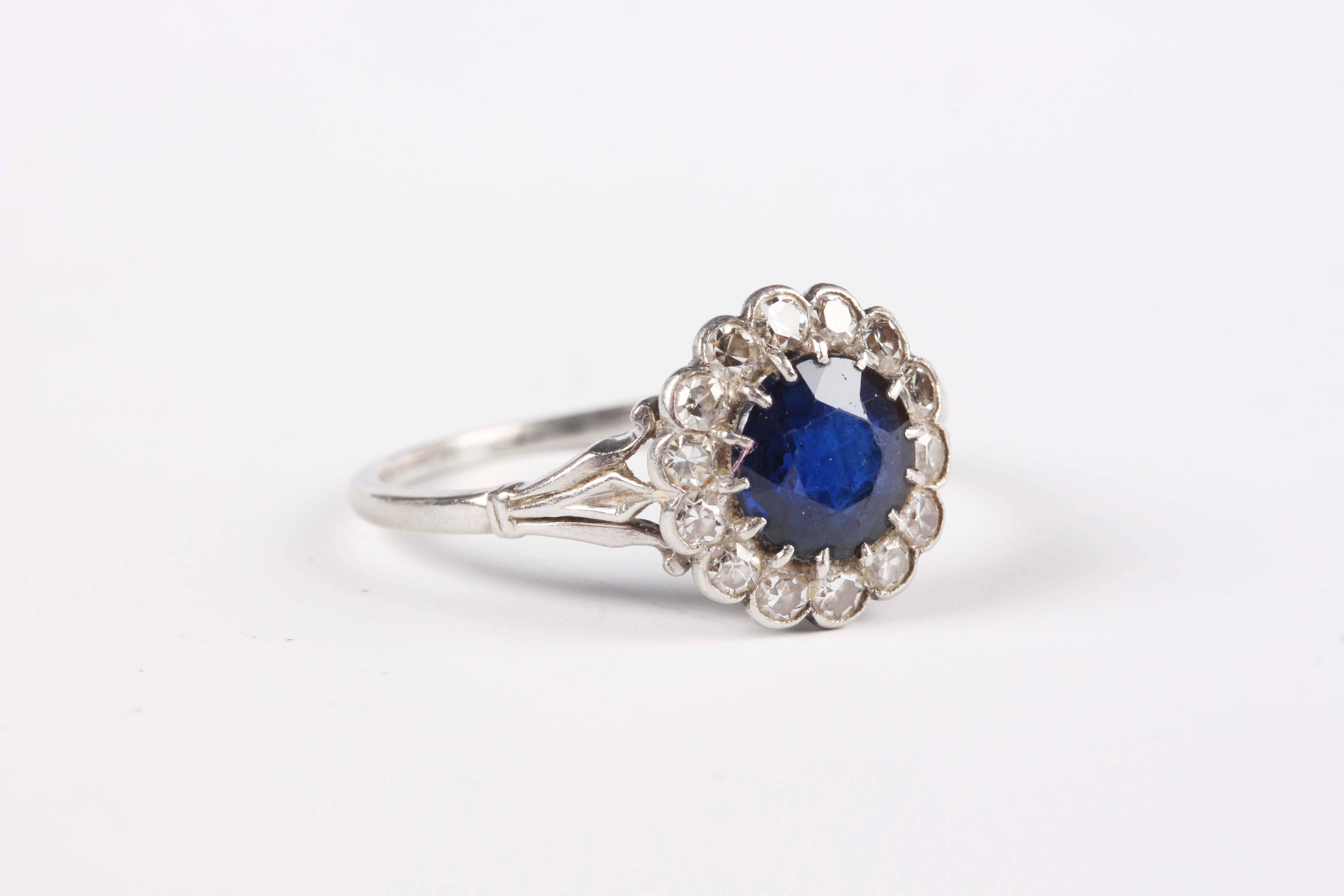 A platinum, sapphire and diamond cluster ring, claw set with the circular cut sapphire within a surround of single cut diamonds, unmarked, weight 3.2g, sapphire weight approx 1.00ct, ring size approx N.