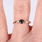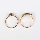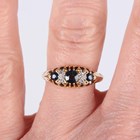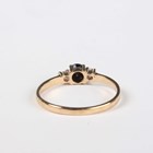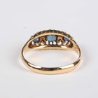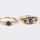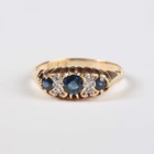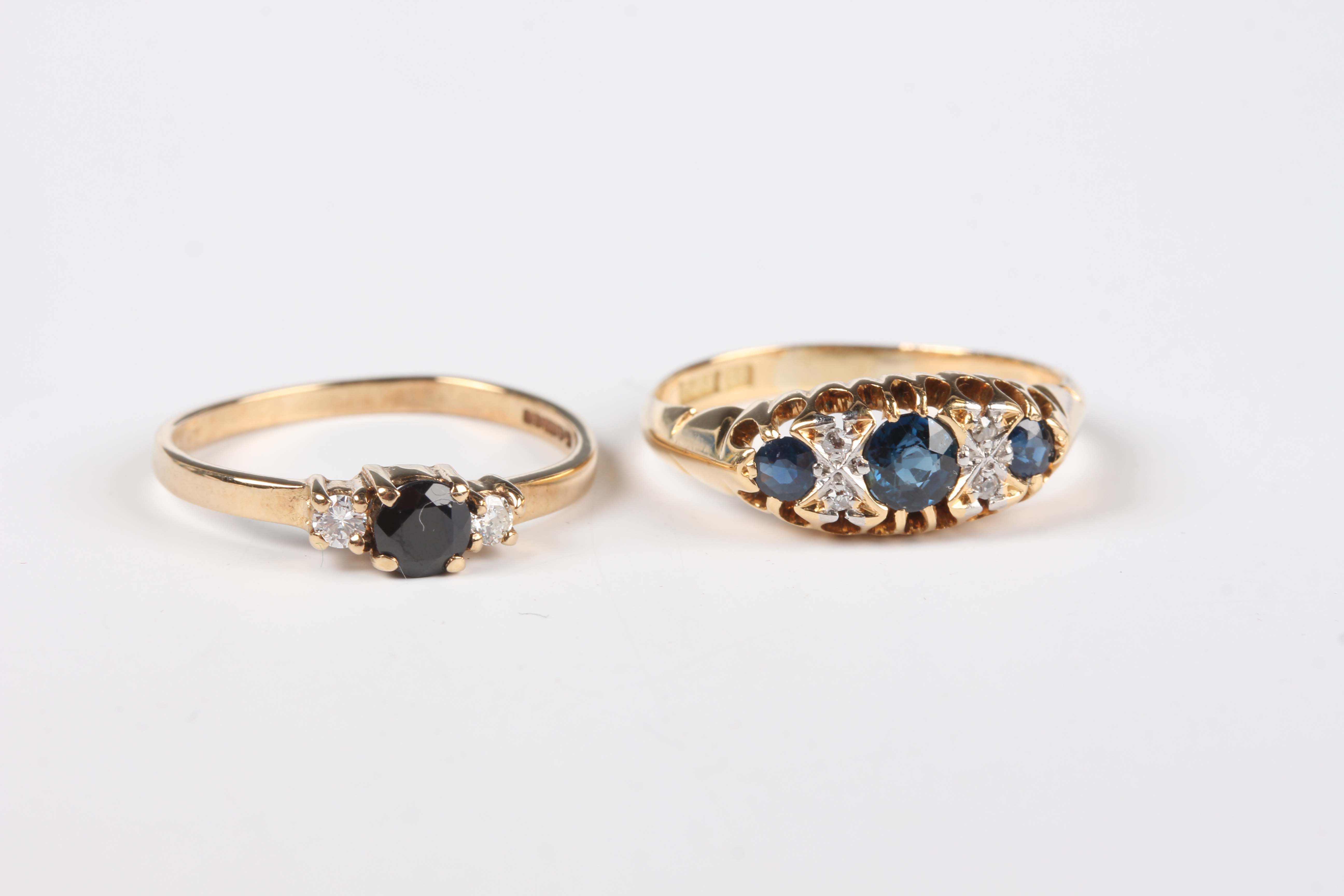 A gold, sapphire and diamond ring, mounted with three circular cut sapphires alternating with two pairs of cushion shaped diamonds, detailed ‘18’, weight 3.2g, ring size approx O1/2, and a 9ct gold ring, claw set with a circular cut sapphire between two circular cut diamonds, weight 1.4g, ring size approx N1/2.